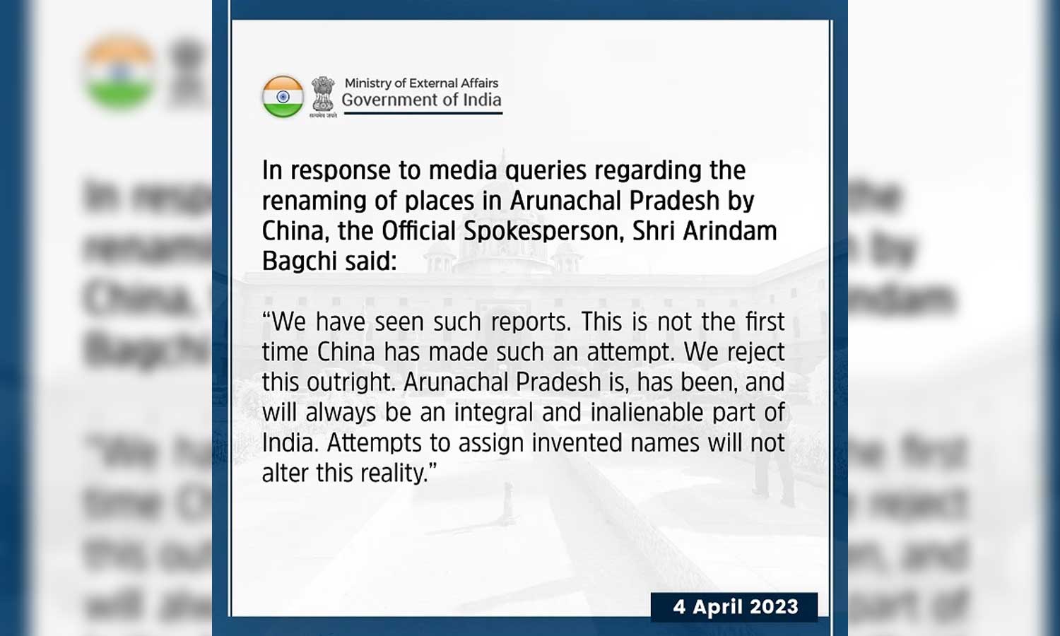 അരുണാചൽ പ്രദേശിലെ സ്ഥലങ്ങളുടെ പേരുമാറ്റി; ചൈനീസ് നടപടിയിൽ എതിർപ്പറിയിച്ച് വിദേശകാര്യ മന്ത്രാലയം