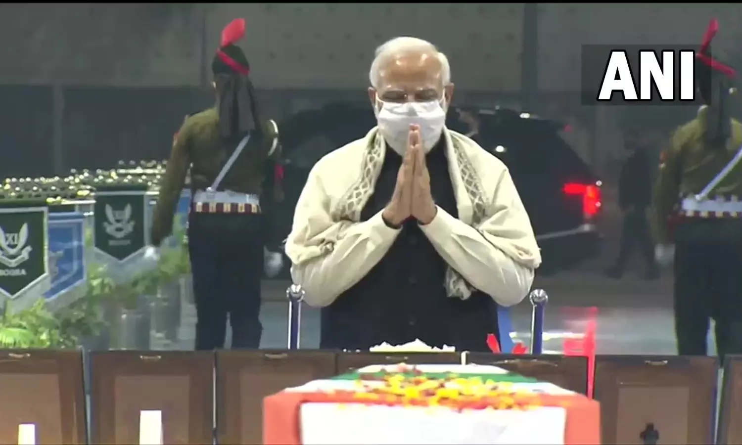 Prime Minister Narendra Modi pays last respects to CDS General Bipin Rawat, his wife Madhulika Rawat and other 11 Armed Forces personnel who lost their lives in the #TamilNaduChopperCrash yesterday. pic.twitter.com/QT3JHKTedq