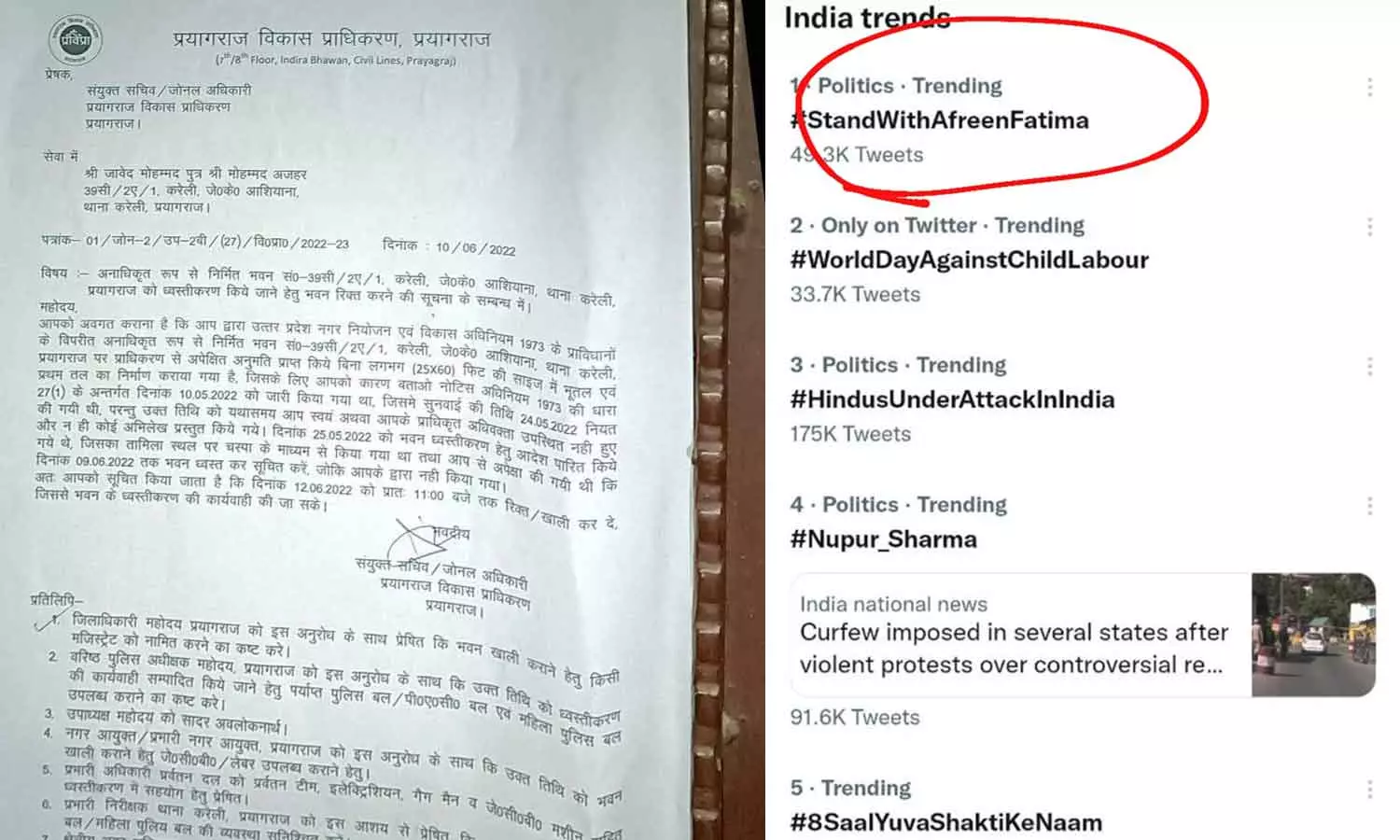 പ്രവാചക നിന്ദക്കെതിരെ പ്രയാഗ്‌രാജിൽ നടന്ന പ്രതിഷേധത്തിൽ പങ്കെടുത്തതിനാണ് അഫ്രീൻ ഫാത്തിമയുടെ കുടുംബത്തെ പൊലീസ് കസ്റ്റഡിയിലെടുത്തത്. ഇതിന് പിന്നാലെയാണ് ഇന്ന് രാവിലെ 11 മണിക്കകം വീട് ഒഴിയണമെന്ന് ആവശ്യപ്പെട്ട് നോട്ടീസ് നൽകിയത്. വൻ പൊലീസ് സന്നാഹമാണ് പ്രദേശത്ത് നിലയുറപ്പിച്ചിട്ടുള്ളത്.