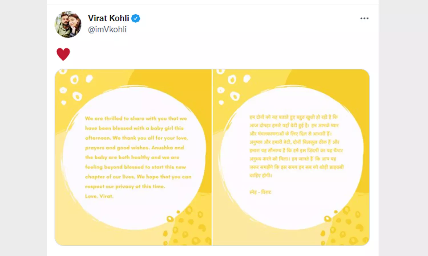 2021ൽ ഏറ്റവുമധികം ലൈക്ക് ചെയ്യപ്പെട്ടത് മകളുടെ ജനനം അറിയിച്ചുള്ള വിരാട് കോഹ്ലിയുടെ ട്വീറ്റ്