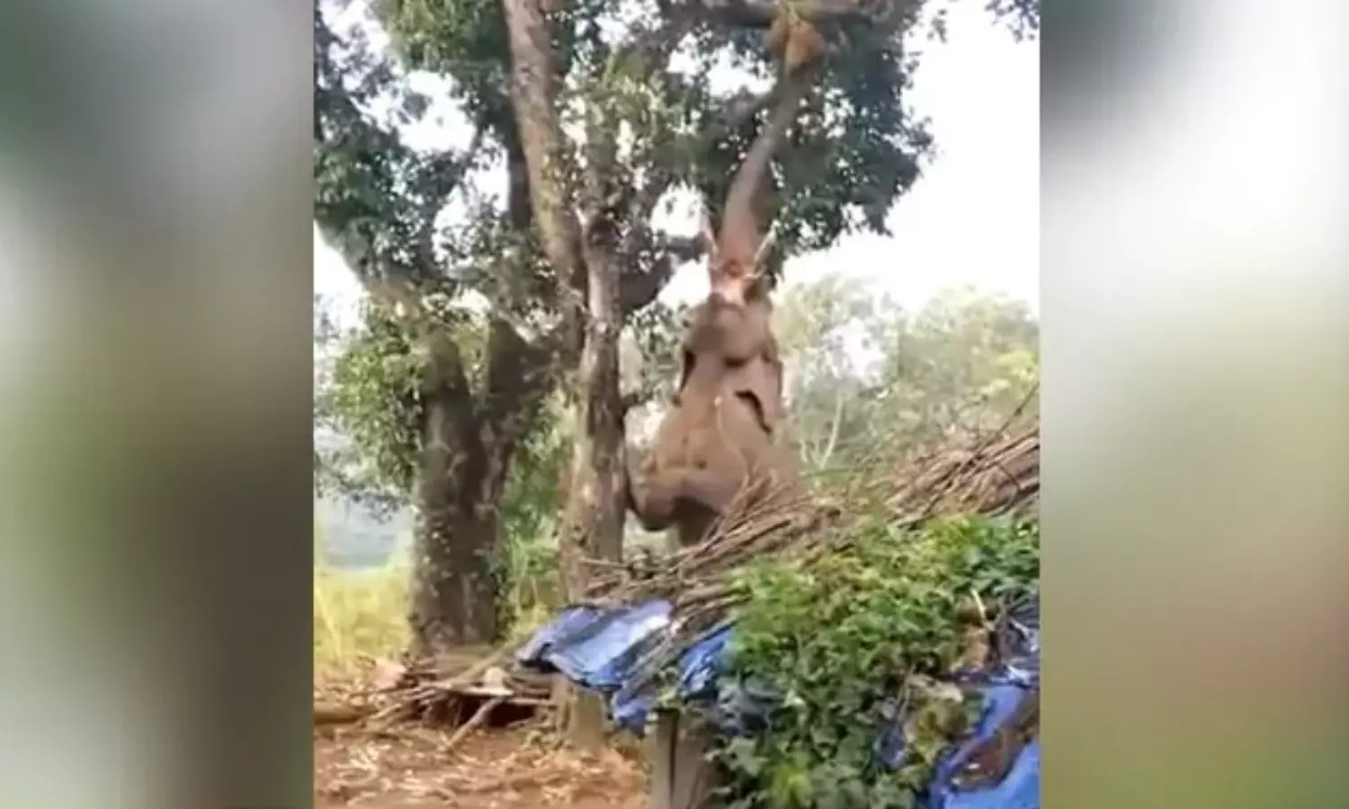 പ്ലാവ് കുലുക്കി, വീണില്ല..കാല് പൊക്കി തുമ്പിക്കൈകൊണ്ട് വലിച്ചിട്ടു; ചക്കയ്ക്ക് വേണ്ടി ആനയുടെ സാഹസം- വീഡിയോ