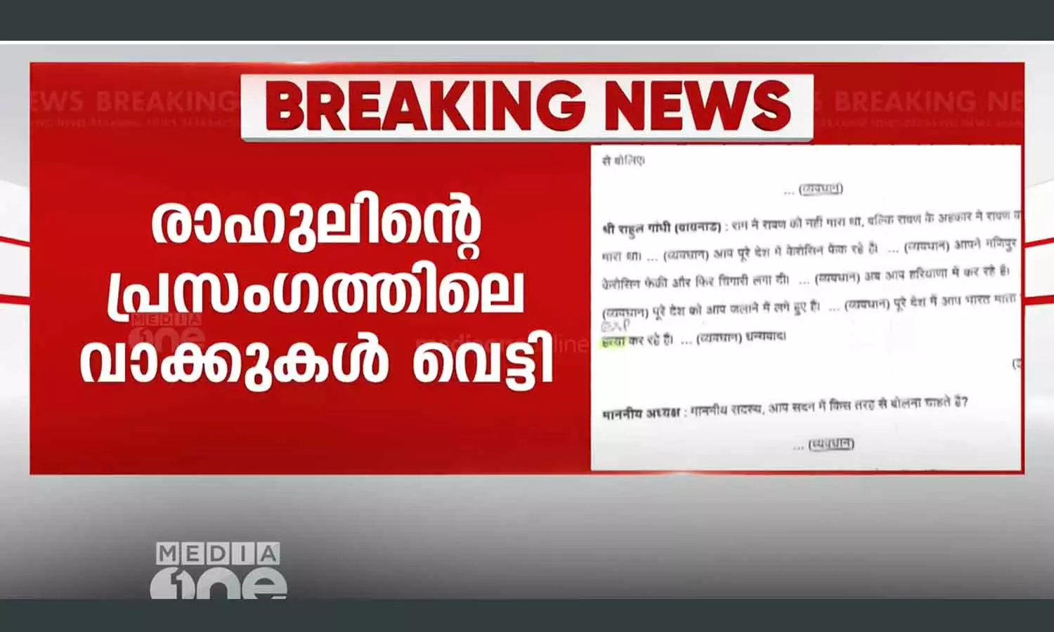 രാഹുലിന്റെ പ്രസംഗത്തിൽ പ്രധാനമന്ത്രിയെ സൂചിപ്പിക്കുന്ന എല്ലാ ഭാഗത്തും പൂർണമായും തിരുത്തൽ വന്നിട്ടുണ്ട്. 24 ഭാഗങ്ങളാണ് വെട്ടിമാറ്റിയത്. ഭാരതമാതാവിനെ ബി.ജെ.പിക്കാർ കൊല ചെയ്തുവെന്നാണ് രാഹുൽ ഗാന്ധി പ്രസംഗത്തിൽ പറഞ്ഞത്. ഇവർ ദേശഭക്തരല്ല, ദേശദ്രോഹികളാണ് എന്നും രാഹുൽ ട്രഷറി ബെഞ്ചിനെ നോക്കി പറഞ്ഞിരുന്നു.