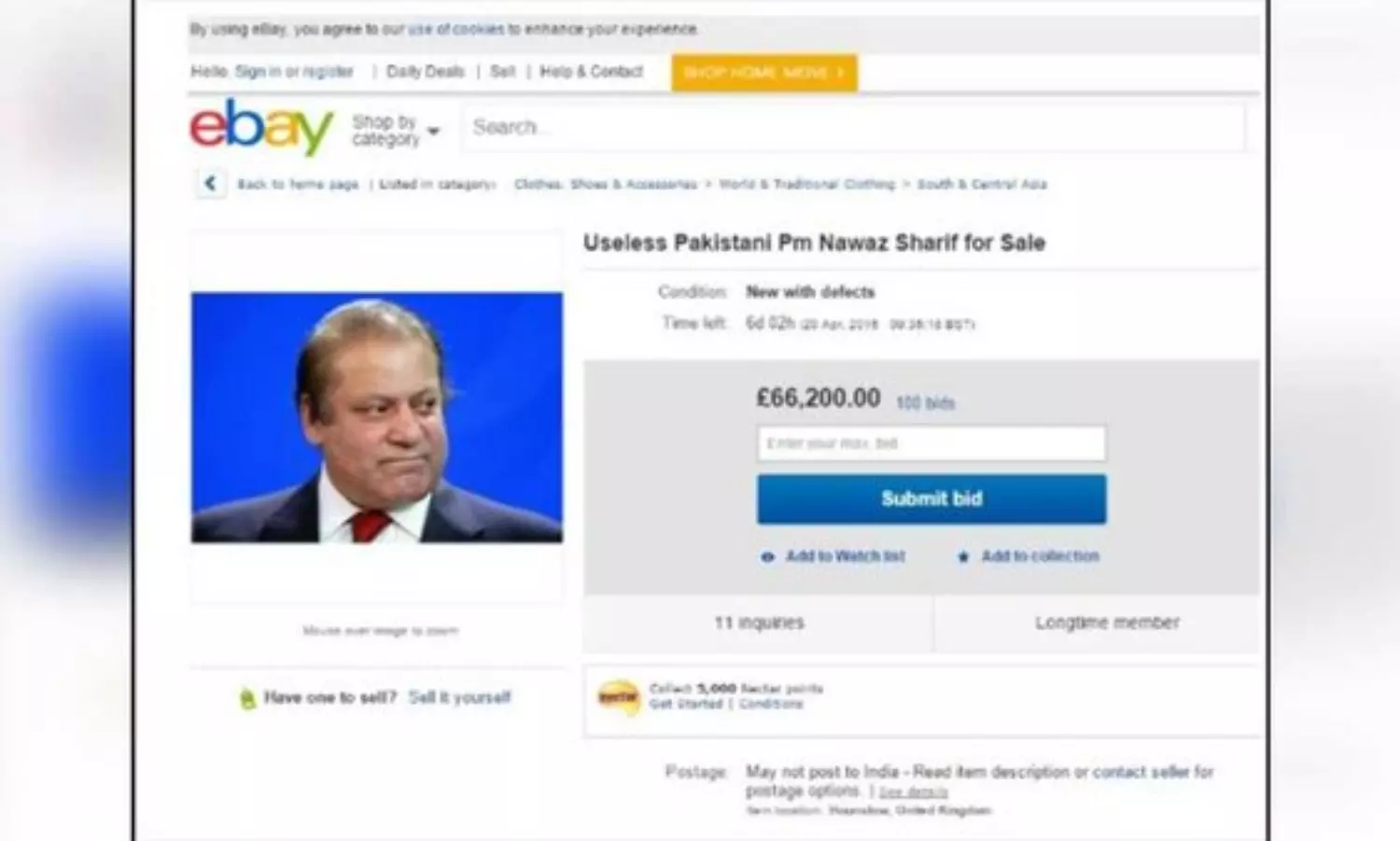 നവാസ് ശരീഫിനെ ഇബെയില് വില്പ്പനക്ക്; വില 62 ലക്ഷം രൂപ