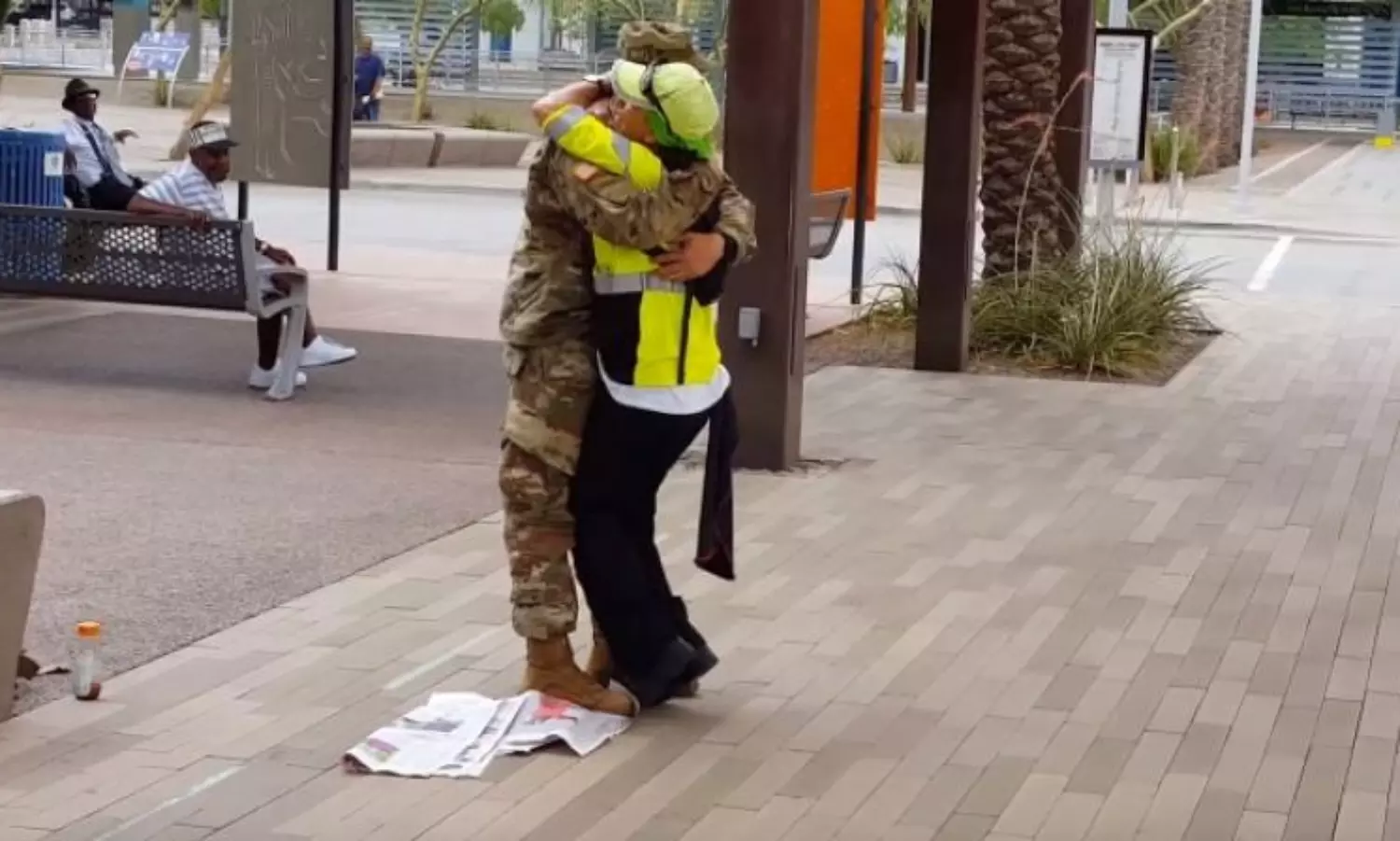 അമേരിക്കന് ആര്മിയിലെ 101മത് എയര്ബോണില് ജോലി ചെയ്യുകയാണ് ഇരുപത്തിയാറുകാരനായ ലാറി സ്റ്റേണ്സ്. മാസങ്ങള്ക്ക് ശേഷം അവധി കിട്ടിയപ്പോള് അമ്മയെ അതിശയിപ്പിക്കാന് തന്നെ അവന് തീരുമാനിച്ചു. അമ്മ ജോലി ചെയ്യുന്ന ഫോണിക്സ് സെന്ട്രല് സ്റ്റേഷന്റെ സമീപത്ത് പോയി പത്രം വായിക്കുന്ന വ്യാജേന ഇരുന്നു. പെട്ടെന്നാണ് അതുവഴി വന്ന ലാറിയുടെ അമ്മ മകനെ കാണുന്നത്. സന്തോഷം കൊണ്ട് അവര് മകന്റെ ദേഹത്തേക്ക് ചാടിക്കയറി, കെട്ടിപ്പിടിച്ചു. കഴിഞ്ഞ ജനുവരിയിലാണ് ലാറി തന്റെ അമ്മയെ ഒടുവില് കാണുന്നത്. അമ്മയുടെയും മകന്റെയും പ്രകടനം കണ്ട ഒരാള് ഇത് ഫോണില് പകര്ത്തി സോഷ്യല് മീഡിയയില് പോസ്റ്റ് ചെയ്യുകയും ചെയ്തു. 1.5 മില്യണ് പേരാണ് ഈ വീഡിയോ കണ്ടത്.