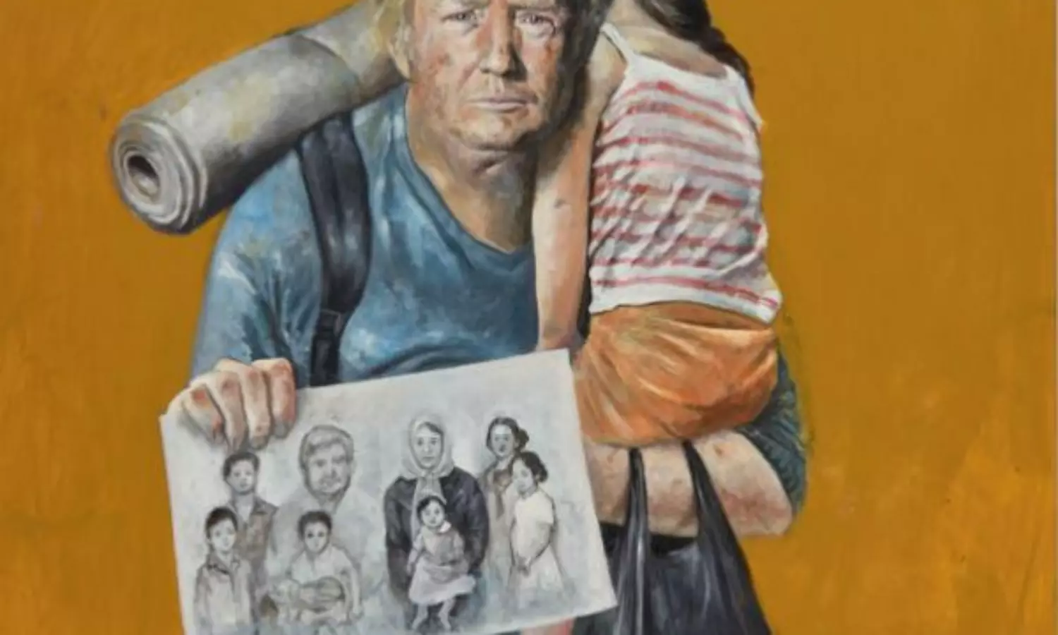 തോളിലുറങ്ങി കിടക്കുന്ന പെൺകുഞ്ഞുമായി ശിഥിലമാക്കപ്പെട്ട കുടുംബത്തിന്റെ ചിത്രവുമായി നിൽക്കുന്ന വൃദ്ധന് യു.എസ് പ്രസിഡൻറ് ഡൊണാൾഡ് ട്രംപിന്റെ ഛായ, വ്ളാദിമിർ പുടിൻ, ബരാക് ഒബാമ, കിം ജോൻ ഉൻ, ബശ്ശാർ അൽ അസദ്, ഡേവിഡ് കാമറൺ, നെതിന്യാഹു, അൽ സിസി തുടങ്ങിയ നേതാക്കൾ അഭയാർഥികൾകളുടെ ഭക്ഷണവിതരണ വരിയിൽ പാത്രവുമായി നിൽക്കുന്നു.. അബ്ദുല്ല അൽ ഒമാരിയുടെ പെയിൻറിങ് പ്രദർശനത്തിൽ നിന്നുള്ള കാൻവാസ് കാഴ്ചകളാണിതെല്ലാം.