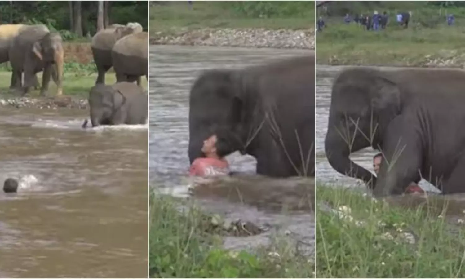 ഒഴുക്കില്പ്പെട്ട പരിശീലകനെ രക്ഷപ്പെടുത്തുന്ന കുട്ടിയാനയുടെ വീഡിയോ വൈറല് !