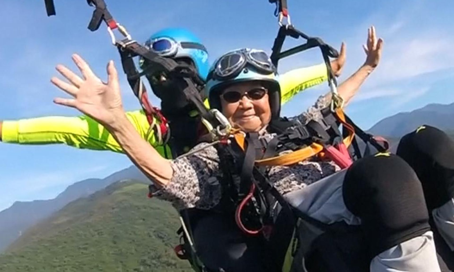 Smiling and waving her hands in the clear summer sky, 93-year-old Wu Rui-lin was enjoying her paragliding ride in...
