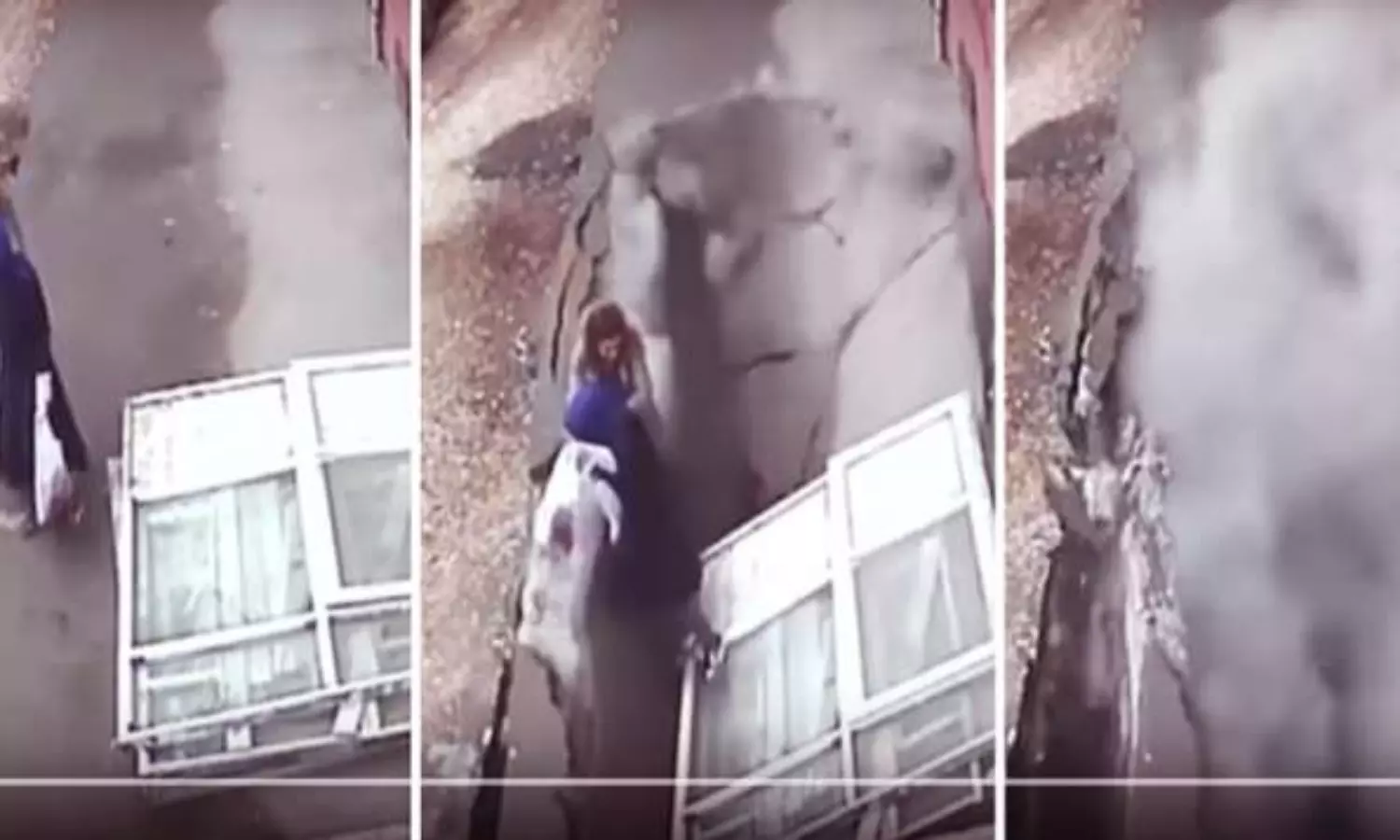 സ്ത്രീകള് സംസാരിച്ചു നില്ക്കെ റോഡ് തകര്ന്ന് താഴോട്ട്, കൂടെ സ്ത്രീകളും: ഞെട്ടിക്കുന്ന വീഡിയോ