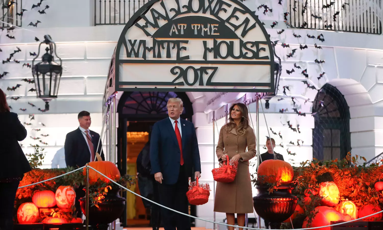 ഓറഞ്ച് നിറത്തിലുള്ള പരവതാനിയിലൂടെ അമേരിക്കന് പ്രസിഡന്റ് ഡോണള്ഡ് ട്രംപും ഭാര്യ മെലാനിയയും പുറത്തേക്ക് വന്നു. പ്രഥമ വനിതയുടെ കൈവശം ഒരു കൂട നിറയെ ചോക്ലേറ്റും ഉണ്ടായിരുന്നു. കുട്ടി പിശാചുക്കളും സുന്ദരികളായ യക്ഷികളും ചേര്ന്ന് അവ കൈപ്പറ്റി. പ്രസിഡന്റിനൊപ്പം നിന്ന് ഫോട്ടോ എടുത്താണ് പലരും മടങ്ങിയത്.