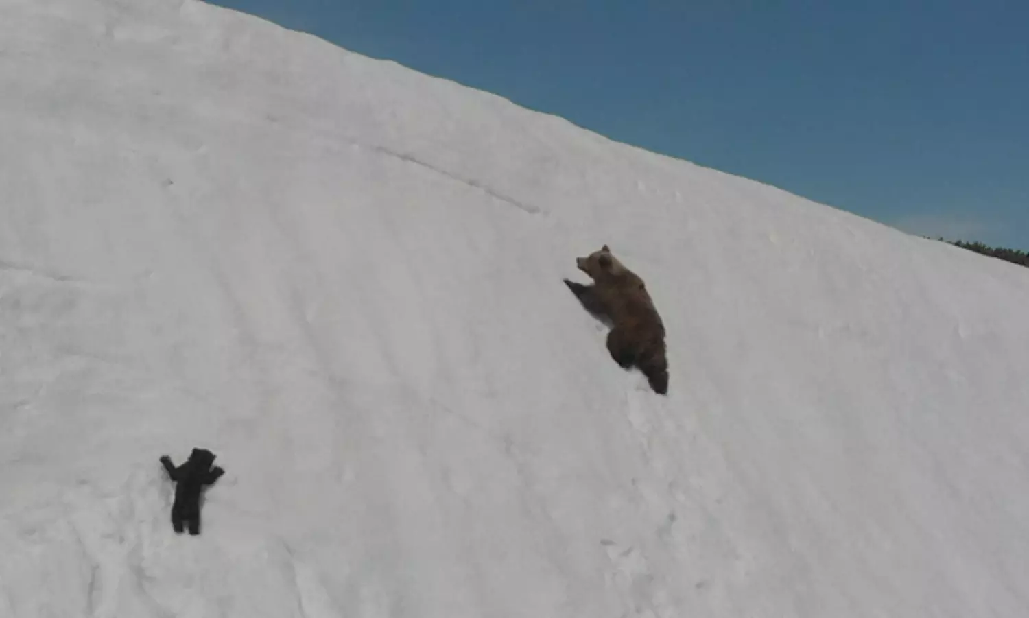 ദൃശ്യങ്ങള് പകര്ത്താന് മൂളി എത്തിയ ഡ്രോണിനെ കണ്ട് ഭയന്നാണ് ഇരുവരും അത്രയധികം ഉയരമില്ലാത്ത പര്വതത്തിന്റെ മുകളിലേക്ക് ഓടിക്കയറാന് ശ്രമിച്ചത്. മൂന്നു തവണയാണ് കരടിക്കുഞ്ഞ് മലമുകളിലെത്തും മുമ്പ് താഴേക്ക് പതിച്ചത്. ആദ്യ രണ്ടു തവണത്തെ ശ്രമവും പരാജയപ്പെട്ട കരടിക്കുഞ്ഞ് തോല്വി വഴങ്ങാന് കൂട്ടാക്കാതെ മൂന്നാം തവണയും കയറി തുടങ്ങി. മൂന്നാം തവണ കരടിക്കുഞ്ഞിന്റെ ശ്രമം വിജയത്തിന്റെ വക്കിലെത്തിയപ്പോഴാണ് ഈ ദൃശ്യങ്ങള് ചിത്രീകരിക്കുന്ന ഡ്രോണ് വില്ലനായത്.