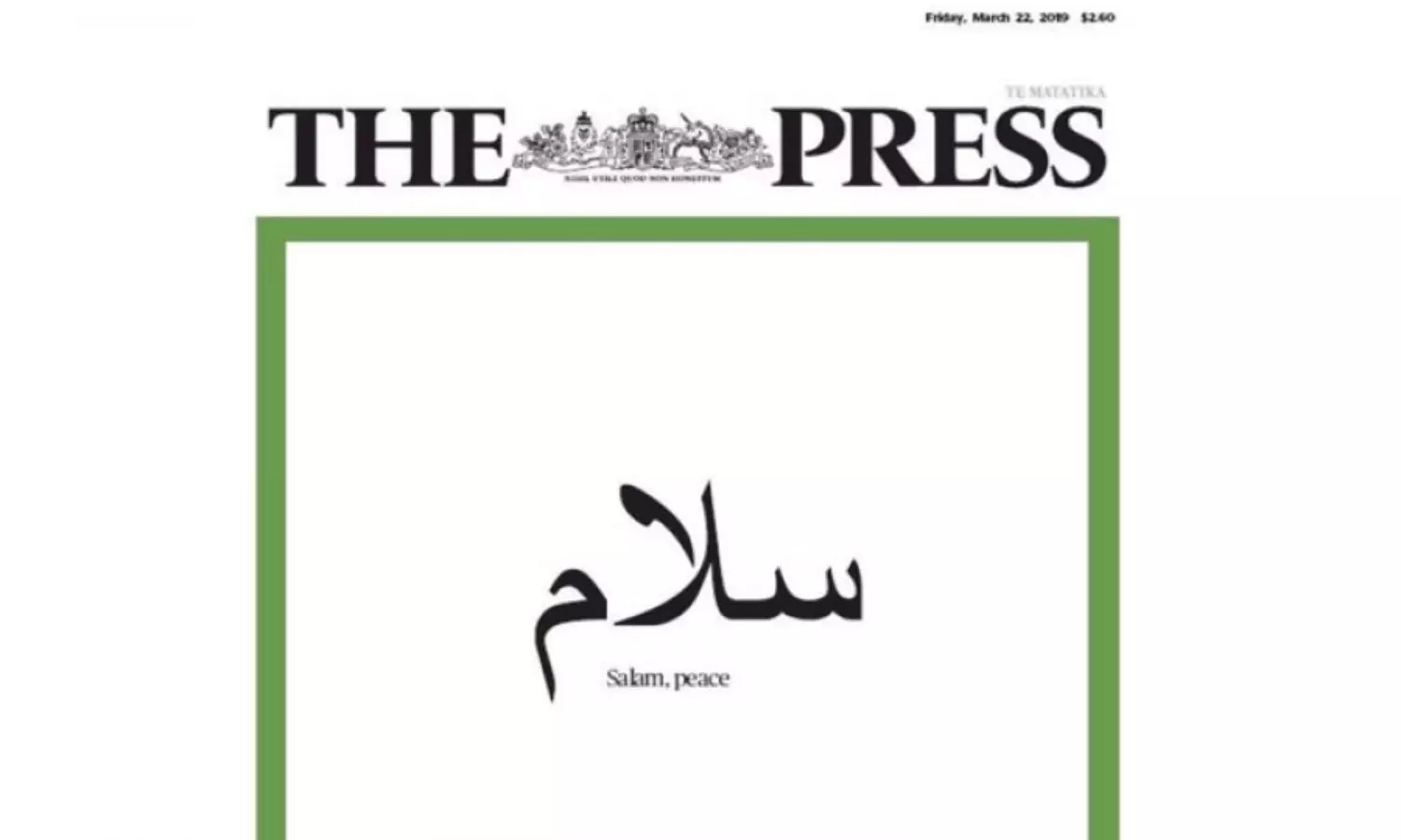 ക്രെെസ്റ്റ് ചർച്ച് ഭീകരാക്രമണത്തിൽ കൊല്ലപ്പെട്ടവർക്ക് ഐക്യദാർഢ്യം പ്രഖ്യാപിച്ച് ന്യൂസിലാൻഡ് പത്രങ്ങൾ. ക്രെെസ്റ്റ് ചർച്ച് ഉൾപ്പടെയുള്ള ദക്ഷിണ ന്യൂസിലാൻഡിലെ പ്രമുഖ പത്രമായ ‘ദ പ്രസ്’ അറബിയിൽ സമാധാനം എന്നർഥം വരുന്ന ‘സലാം’ എന്ന സന്ദേശവുമായാണ് പുറത്തിറങ്ങിയത്.