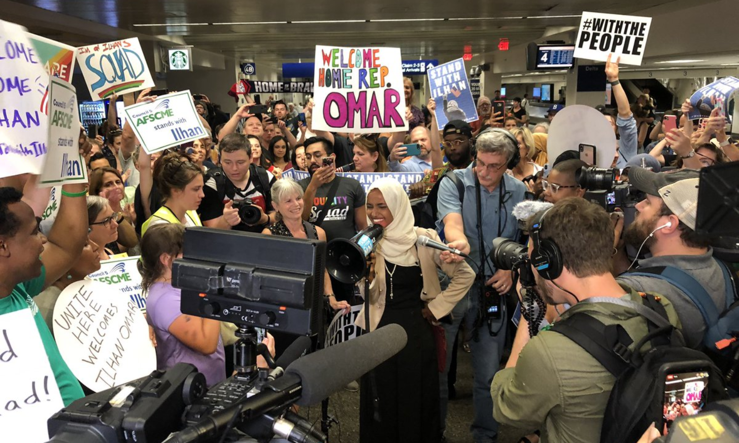 മിനസോട്ട: യു.എസ് പ്രസിഡണ്ട് ഡൊണാൾഡ് ട്രംപിന്റെ വംശീയ വിദ്വേഷ പരാമർശങ്ങൾക്കിരയായ യു.എസ് കോൺഗ്രസ് പ്രതിനിധി ഇൽഹാൻ ഉമറിന് അവർ പ്രതിനിധീകരിക്കുന്ന മിനസോട്ടയിൽ ഊഷ്മള സ്വീകരണം. ഡെമോക്രാറ്റിക് പ്രതിനിധിയായ ഇൽഹാനെ സ്വീകരിക്കാൻ നൂറുകണക്കിനാളുകൾ മിനിയപൊലീസിലെ സെന്റ് പോൾ വിമാനത്താവളത്തിലെത്തി. സൊമാലിയയിൽ ജനിച്ച് യു.എസ്സിലേക്ക് കുടിയേറിയ ഇൽഹാൻ അടക്കം കറുത്ത വർഗക്കാരായ നാല് വനിതാ അംഗങ്ങളോട് 'സ്വന്തം നാട്ടിലേക്ക് തിരിച്ചുപോയി അവിടത്തെ കുഴപ്പങ്ങൾ തീർക്കാൻ' ട്രംപ് ആവശ്യപ്പെട്ടത് വൻ വിവാദമായിരുന്നു.