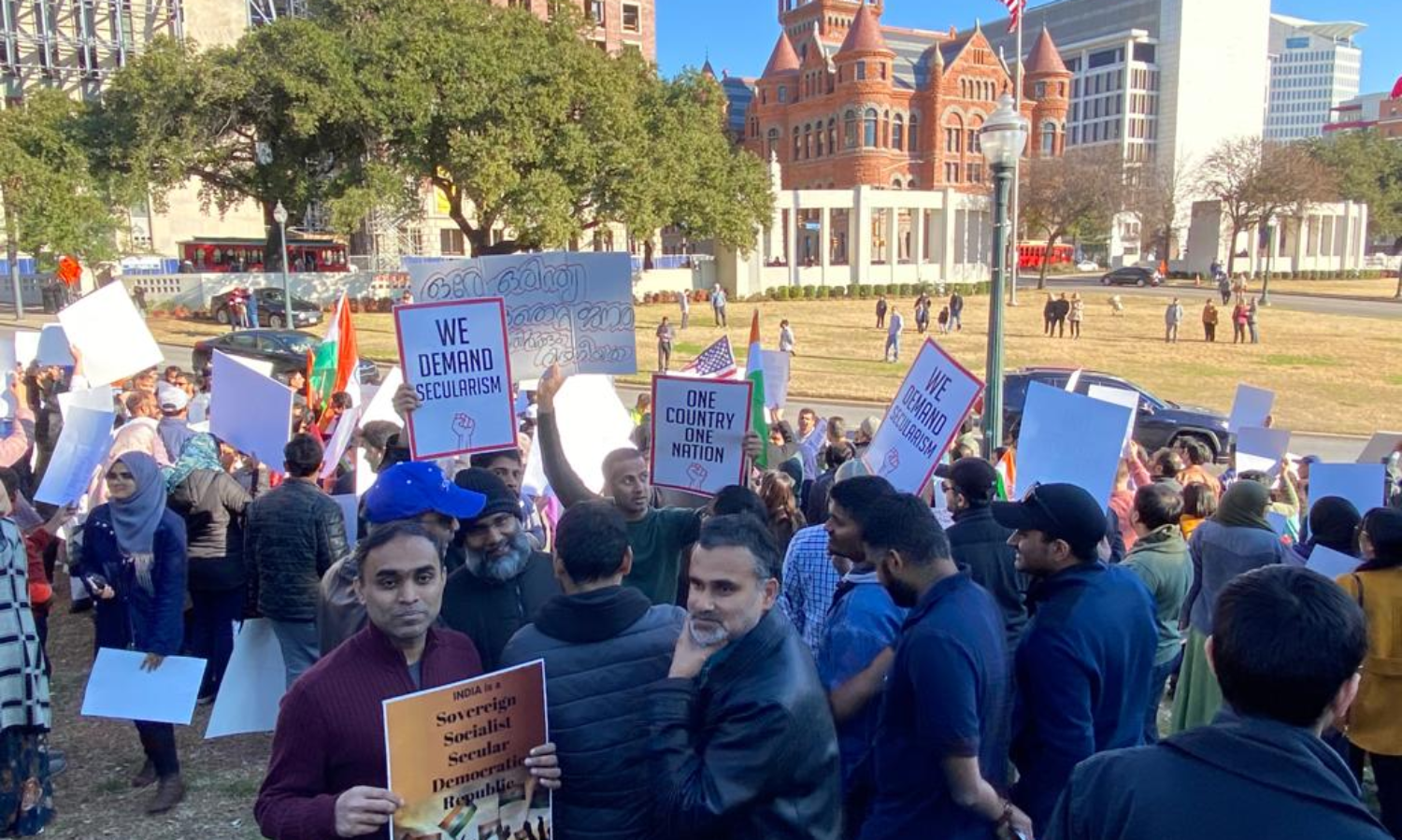 സംഘപരിവാർ ഇന്ത്യ വിടുക, എൻ.ആർ.സി-സി.എ.എ നിയമങ്ങൾ പിൻവലിക്കുക തുടങ്ങിയ മുദ്രാവാക്യങ്ങളെഴുതിയ പ്ലക്കാർഡുകളുമായി എത്തിയ പ്രതിഷേധക്കാർ ഇന്ത്യാ സംരക്ഷണ പ്രതിജ്ഞയും ചൊല്ലി