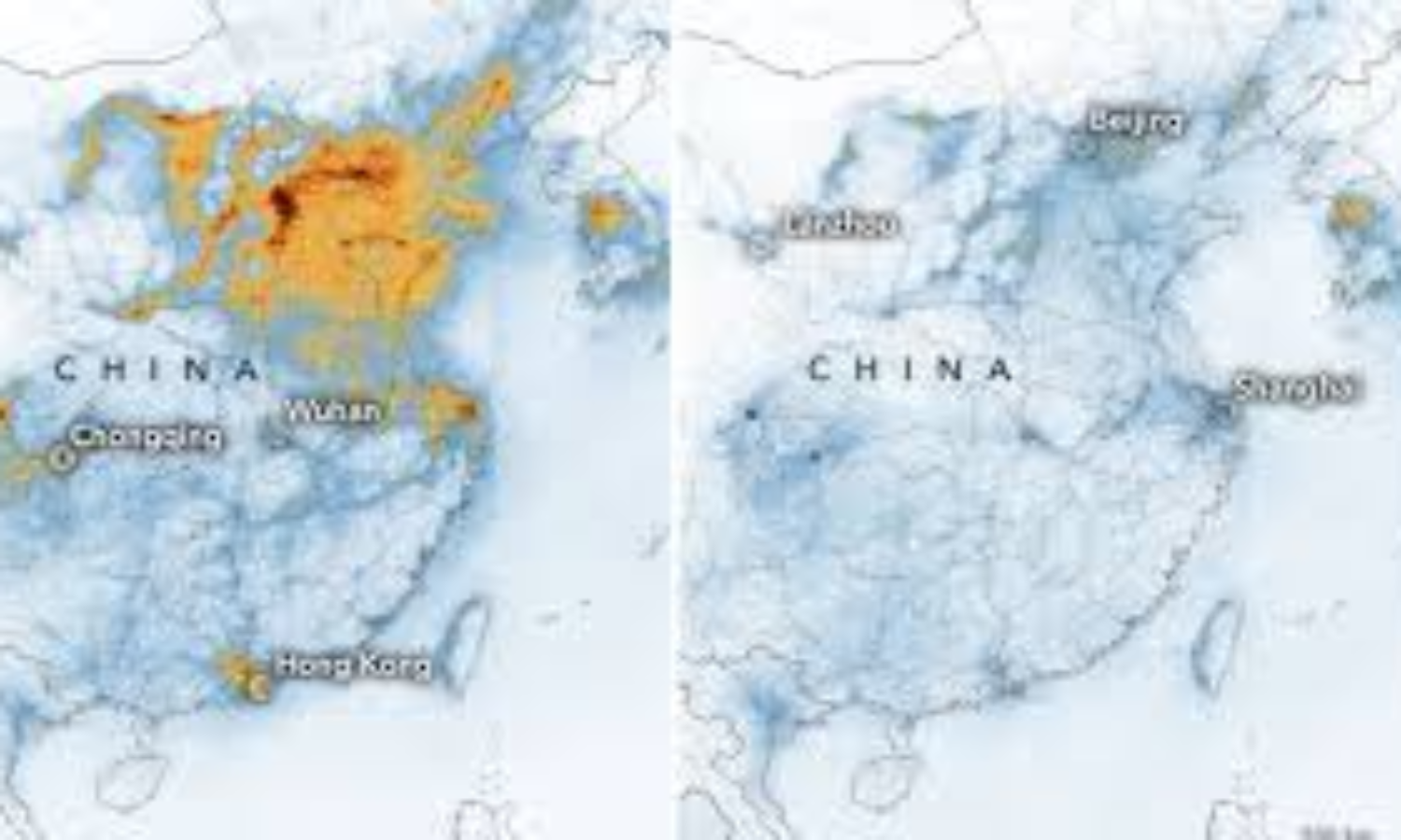 ജനുവരി ഒന്ന് മുതല് 20 വരെയുള്ള അന്തരീക്ഷത്തിന്റെ ചിത്രവും ഫെബ്രുവരി 10 മുതല് 25 വരെയുള്ള ചിത്രവുമാണ് പുറത്തുവന്നത്. ആദ്യ ചിത്രത്തെ അപേക്ഷിച്ച് രണ്ടാമത്തേതില് അന്തരീക്ഷത്തില് നൈട്രജന് ഡൈ ഓക്സൈഡിന്റെ സാന്നിധ്യം വളരെക്കുറവാണ്. ഇത് കൊറോണ വൈറസ് ബാധ പൊട്ടിപ്പുറപ്പെട്ടശേഷം ചൈനയില് സാമ്പത്തിക രംഗത്തുണ്ടായ തളര്ച്ചയുമായി ഇത് ബന്ധപ്പെട്ടിരിക്കുന്നുവെന്ന് നാസ പറയുന്നു. ചൈന ജനങ്ങളെ നിരീക്ഷണത്തിൽ പാർപ്പിക്കുന്നത് ആരംഭിക്കുന്നതിന് മുമ്പുള്ള ചിത്രമാണ് ആദ്യത്തേത്. രണ്ടാമത്തേത് നിരീക്ഷണകാലത്തേതും.