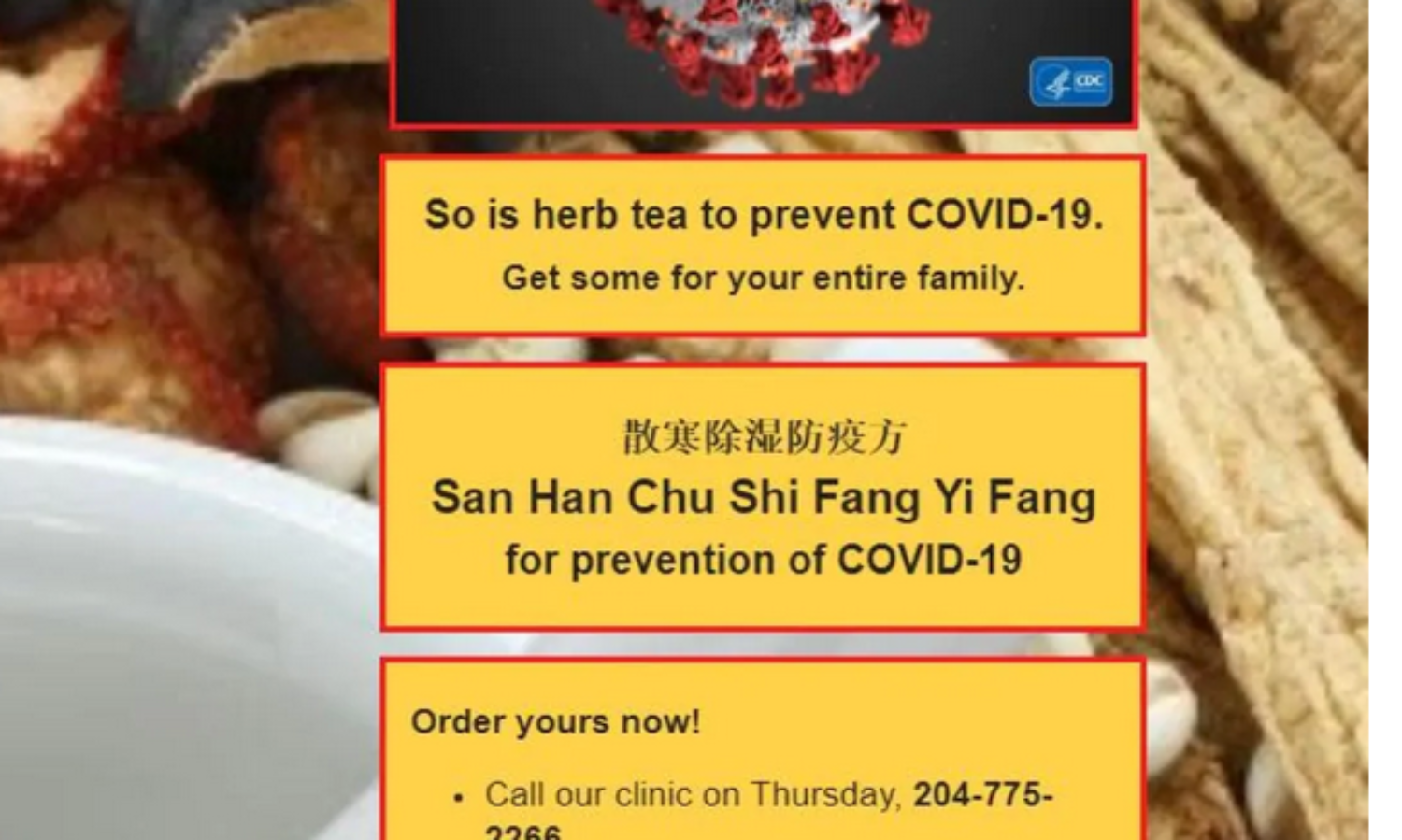 കനേഡിയന് ബ്രോഡ്കാസ്റ്റിംഗ് കോര്പ്പറേഷന്(സിബിസി)രഹസ്യ ക്യാമറ ഉപയോഗിച്ച് ഈയിടെ നടത്തിയ അന്വേഷണത്തിലാണ് കോവിഡിനെ പ്രതിരോധിക്കാനുള്ള ഹെര്ബല് ടീയെന്നു അവകാശപ്പെട്ട് വിന്നിപെഗ് അക്യുപങ്ചര് ചികിത്സ കച്ചവടം നടത്തുന്ന കാര്യം പുറത്തുവന്നത്. ഈ സാഹചര്യത്തിലാണ് കനേഡിയന് പൗരന്മാര്ക്ക് ആരോഗ്യ വിദഗ്ദ്ധര് മുന്നറിയിപ്പ് നല്കിയത്.