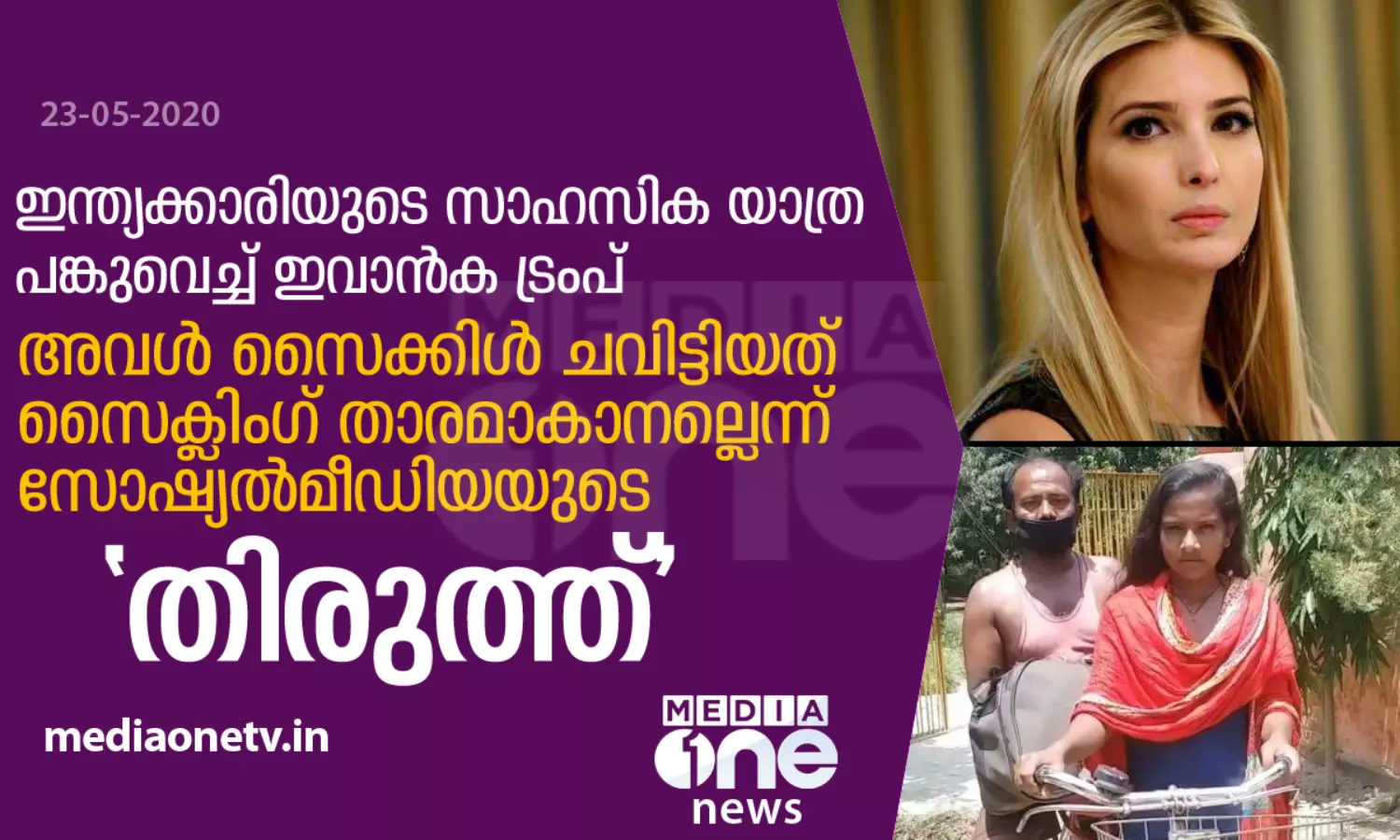 ലോക്ഡോണിനിടെ പരിക്കേറ്റ പിതാവിനേയും പിന്നിലിരുത്തി സ്വന്തം ഗ്രാമത്തിലേക്ക് 1200 കിലോമീറ്റര് ദൂരം ഏഴ് ദിവസം കൊണ്ട് സൈക്കിളില് പോയ 15കാരിയുടെ വാര്ത്ത ദിവസങ്ങള്ക്ക് മുമ്പാണ് വന്നത്. ജ്യോതികുമാരിയെ ട്രയല്സിന് ഇന്ത്യയുടെ സൈക്ലിംഗ്ഫേഡറേഷന് ക്ഷണിക്കുകയും ചെയ്തിരുന്നു. ഇക്കാര്യങ്ങള് ഉള്പ്പെടുത്തിയാണ് അമേരിക്കന് പ്രസിഡന്റിന്റെ മകള് ജ്യോതികുമാരിയെ അഭിനന്ദിച്ച് രംഗത്തെത്തിയത്. എന്നാല് ദാരിദ്ര്യവും ലോക്ഡൗണും മൂലം ഗതികെട്ടാണ് ജ്യോതി കുമാരി ഈ സാഹസത്തിന് മുതിര്ന്നതെന്നും ഇതില് അഭിനന്ദിക്കാനും സന്തോഷിക്കാനും ഒന്നുമില്ലെന്നുമാണ് സോഷ്യല്മീഡിയയുടെ തിരുത്ത്.