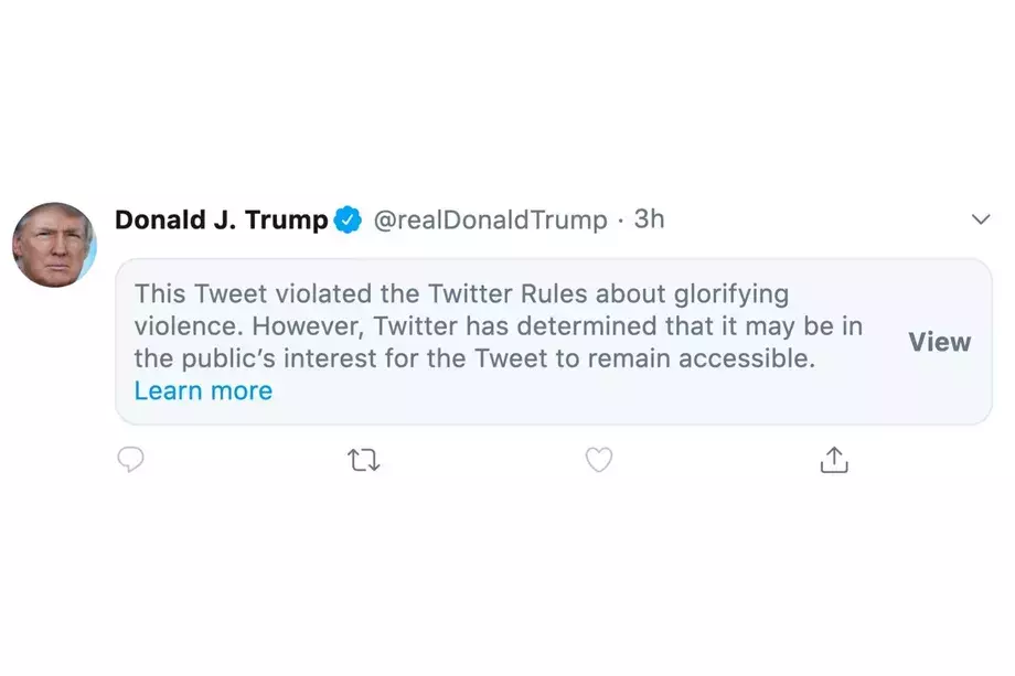തങ്ങളുടെ നയങ്ങള്ക്ക് വിരുദ്ധമായതാണെന്ന് കണ്ടെത്തിയതിനെ തുടര്ന്നാണ് നടപടിയെന്നാണ് ട്വിറ്റര് വിശദീകരണം. എങ്കിലും ഇതുവരെ ട്വീറ്റ് ഫീഡില് നിന്നും നീക്കംചെയ്യാന് ട്വിറ്റര് തയ്യാറായിട്ടില്ല. ട്രംപിന്റെ ട്വിറ്റര് ഫീഡില് ഈ ട്വീറ്റ് തങ്ങളുടെ നയങ്ങള്ക്ക് വിരുദ്ധമായി അക്രമം പ്രോത്സാഹിപ്പിക്കുന്നുവെന്നും പൊതു താത്പര്യം പരിഹണിച്ച് ഇവിടെ നിലനിര്ത്തിയിരിക്കുന്നുവെന്നുമാണ് കാണാനാവുക. ട്വിറ്ററിന്റെ ഈ സന്ദേശത്തിനൊപ്പമുള്ള വ്യു എന്ന ഭാഗത്ത് ക്ലിക്ക് ചെയ്താല് ട്വീറ്റ് കാണാനാവും.