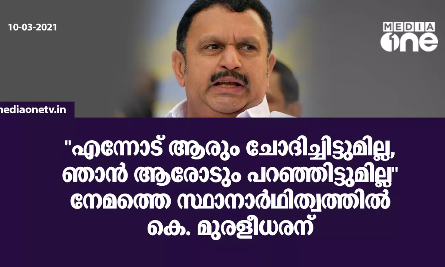 ''എന്നോട് ആരും ചോദിച്ചിട്ടുമില്ല, ഞാന് ആരോടും പറഞ്ഞിട്ടുമില്ല'' നേമത്തെ സ്ഥാനാര്ഥിത്വത്തില് കെ. മുരളീധരന്
