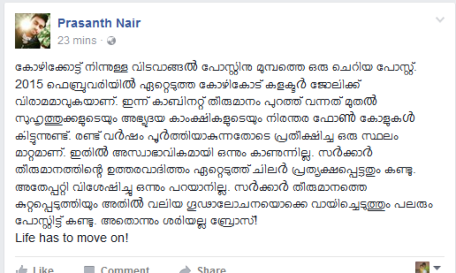സര്ക്കാര് തീരുമാനത്തെ വിമര്ശിച്ചും അതില് വലിയ ഗൂഢാലോചനയൊക്കെ വായിച്ചെടുത്തും പലരും പോസ്റ്റിട്ട് കണ്ടെന്നും അതൊന്നും ശരിയല്ലെന്നും ഫേസ്ബുക്ക് പോസ്റ്റ്