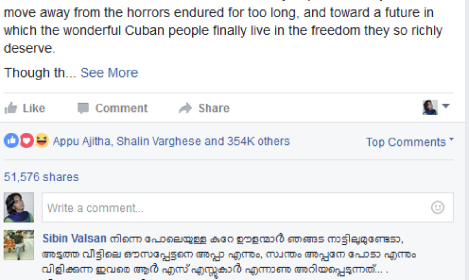 ഫിദല് കാസ്ട്രോയെ അധിക്ഷേപിച്ചു കൊണ്ടുള്ള ട്രംപിന്റെ ഫേസ്ബുക്ക് പോസ്റ്റിന് താഴെയാണ് മലയാളത്തില് കൂട്ടകമന്റുകള്.