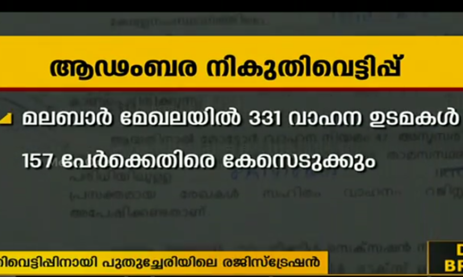അതിനിടെ നികുതി വെട്ടിക്കാനായി കോഴിക്കോട്, വയനാട്, കണ്ണൂര്, കാസര്ഗോഡ് ജില്ലകളില് സ്ഥിരതാമസക്കാരായ 331 പേര് വാഹനങ്ങള് പുതുച്ചേരിയില് രജിസ്റ്റര് ചെയ്തതായി കണ്ടെത്തി. ഇതില് 157 വാഹന ഉടമകള്ക്കെതിരെ കേസെടുക്കാനാണ് ക്രൈംബ്രാഞ്ച് തീരുമാനം. 16 വാഹന ഉടമകളില് നിന്നായി ഇതിനകം 1,42,14875 രൂപ ഈടാക്കിക്കഴിഞ്ഞു. കോഴിക്കോട് കൊടുവള്ളി മേഖലകളിലായി ആകെ 71 വാഹനങ്ങള് നികുതി വെട്ടിപ്പ് നടത്തുന്നതായി മോട്ടോര് വാഹന വകുപ്പ് കണ്ടെത്തി. എഴ് വാഹനങ്ങളില് നിന്നായി 88 ലക്ഷം രൂപ നികുതി ഈടാക്കിക്കഴിഞ്ഞു. 49 വാഹനങ്ങള്ക്കെതിരെ ക്രൈബ്രാഞ്ച് കേസെടുക്കും. ബാക്കിയുള്ളവരുടെ വിശദീകരണം കിട്ടുന്ന മുറയ്ക്കായിരിക്കും മോട്ടോര് വാഹന വകുപ്പ് നടപടിയെടുക്കുക.