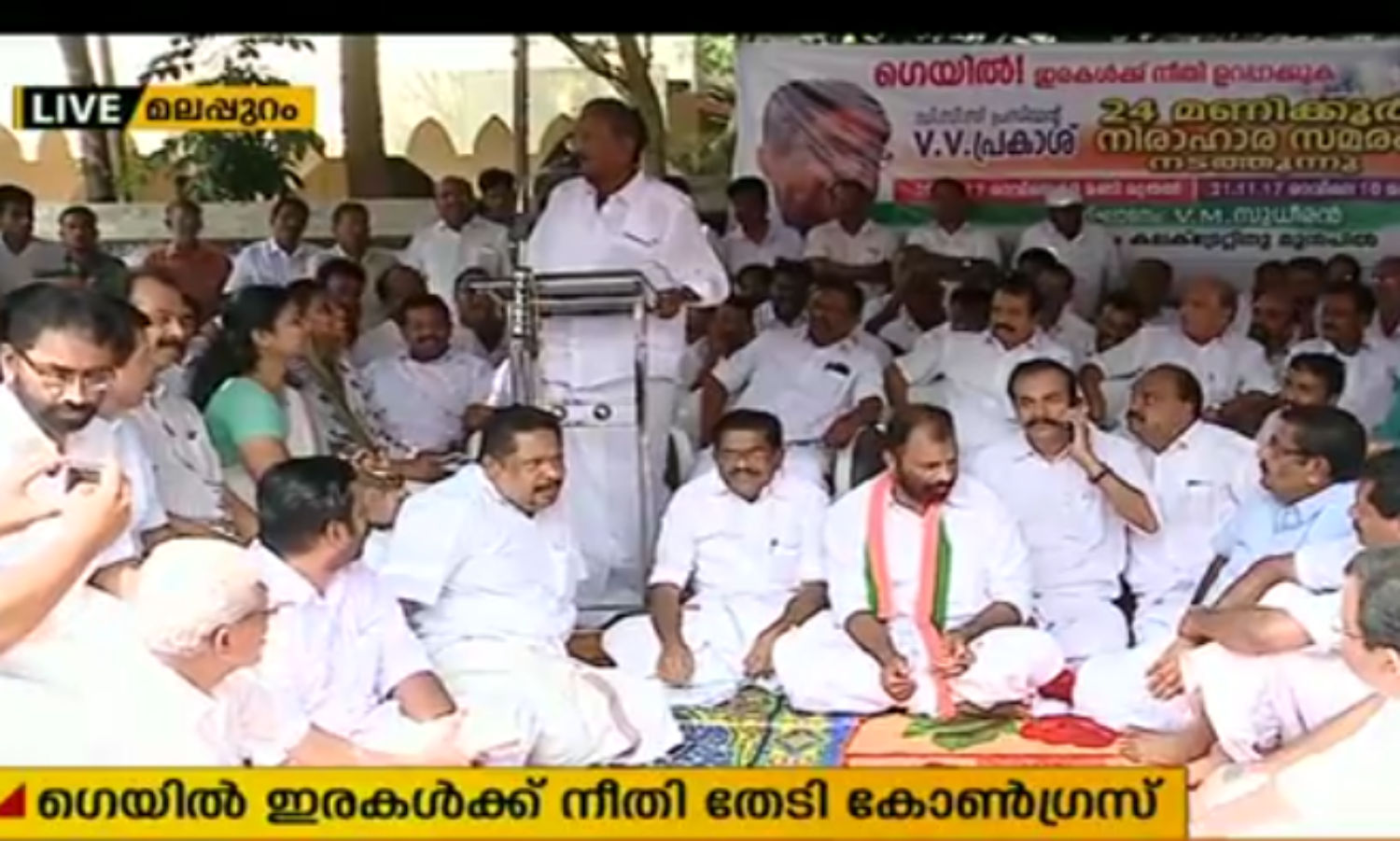 ഗെയില് ഇരകള്ക്ക് നീതി ലഭ്യമാക്കണമെന്ന് ആവശ്യപ്പെട്ട് മലപ്പുറം ഡിസിസി പ്രസിഡന്റ് വി.വി പ്രകാശ് 24 മണിക്കൂര് നിരാഹാര സമരം ആരംഭിച്ചു. പദ്ധതിക്കായി സ്ഥലം വിട്ടുനല്കുന്നവര്ക്ക് നാലിരട്ടി നഷ്ടപരിഹാരം നല്കാതെ സമരം അവസാനിപ്പിക്കില്ലെന്ന് സമരം ഉദ്ഘാടനം ചെയ്ത വി.എം സുധീരന് പറഞ്ഞു. സമരം കെപിസിസി ഏറ്റെടുക്കാത്തതിനെക്കുറിച്ച് ചോദിച്ചപ്പോള് സുധീരന് വ്യക്തമായ മറുപടി പറഞ്ഞില്ല.