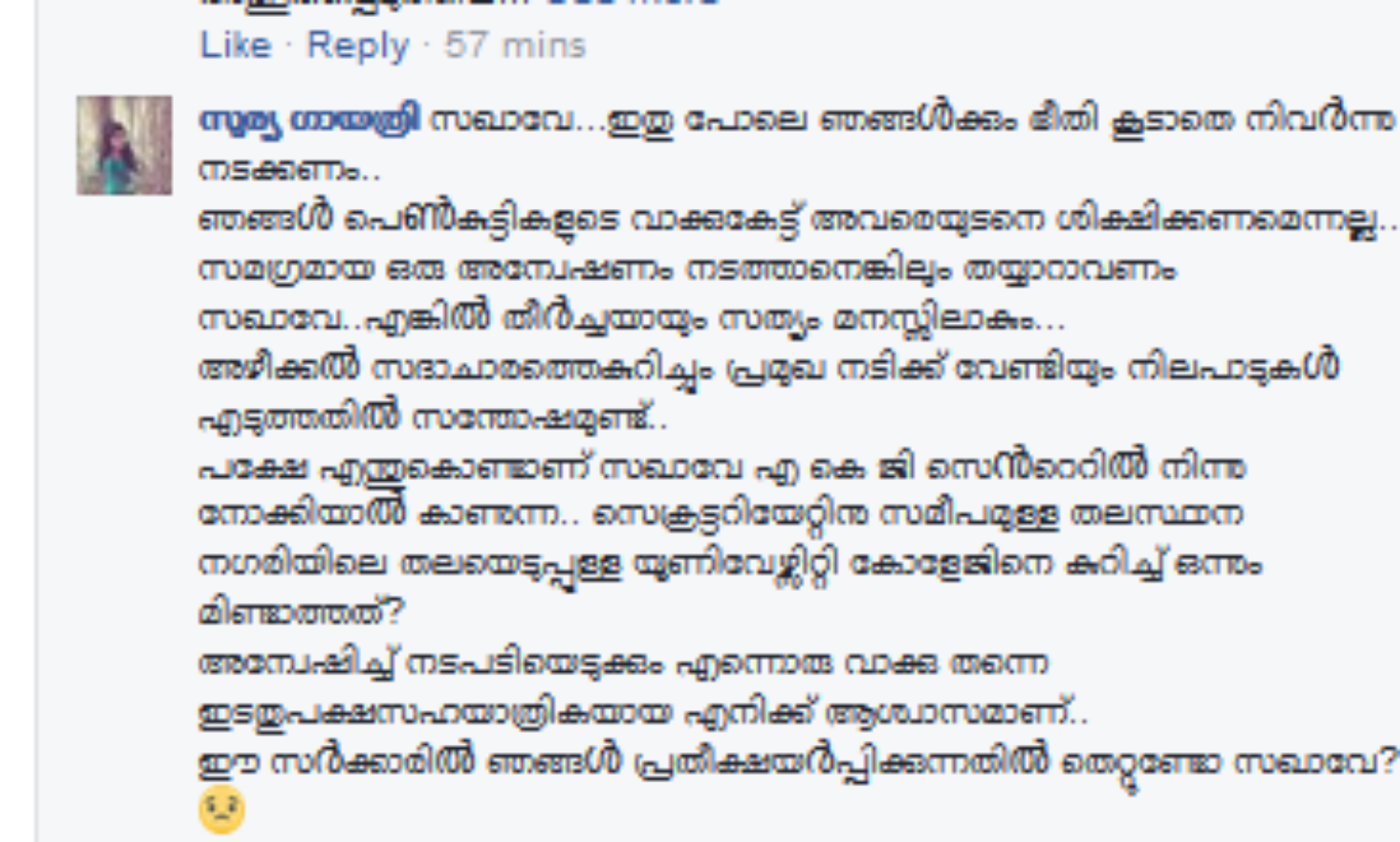അന്വേഷിച്ച് നടപടിയെടുക്കും എന്നൊരു വാക്കു തന്നെ ഇടതുപക്ഷസഹയാത്രികയായ എനിക്ക് ആശ്വാസമാണ്..