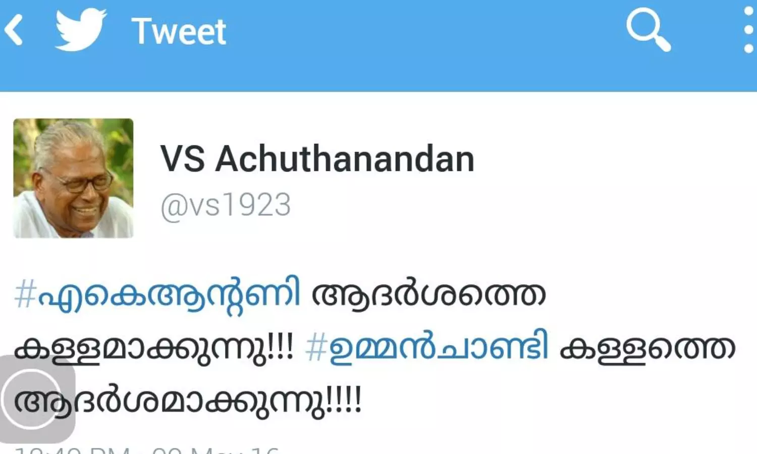സോഷ്യല്മീഡിയയില് അടുത്തകാലത്താണ് പ്രതിപക്ഷ നേതാവ് വിഎസ് അച്യുതാനന്ദന് അരങ്ങേറ്റം കുറിച്ചതെങ്കിലും ഫേസ്ബുക്കിലും ട്വിറ്ററിലും താരം ഈ മുതിര്ന്ന കമ്യൂണിസ്റ്റ് നേതാവ് തന്നെ. പഞ്ച് ഡയലോഗുമായി വിഎസ് ഭരണപക്ഷത്തിനും ബിജെപിക്കുമെതിരെ ആഞ്ഞടിക്കല് തുടരുകയാണ്. 'എകെ ആന്റണി ആദര്ശത്തെ കള്ളമാക്കുന്നു, ഉമ്മന്ചാണ്ടി കള്ളത്തെ ആദര്ശമാക്കുന്നു' - വിഎസിന്റെ പുതിയ ട്വീറ്റാണിത്.