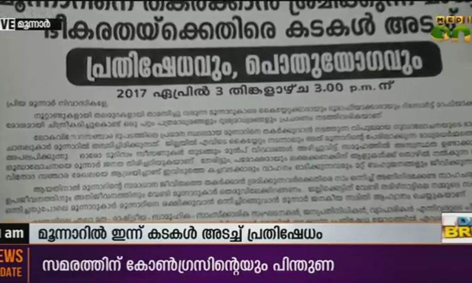 മൂന്നാറിലെ ജനങ്ങളെ മുഴുവന് കൈയ്യേറ്റകാരായി ചിത്രീകരിക്കുന്നു എന്നാരോപിച്ച് വിവിധ മതസംഘടനകളും വ്യാപാരി സമൂഹവും ചേര്ന്ന മൂന്നാര് ജനകീയ സമിതിയാണ് കടകളടച്ച് സമരത്തിന് ആഹ്വാനം നല്കിയത്.