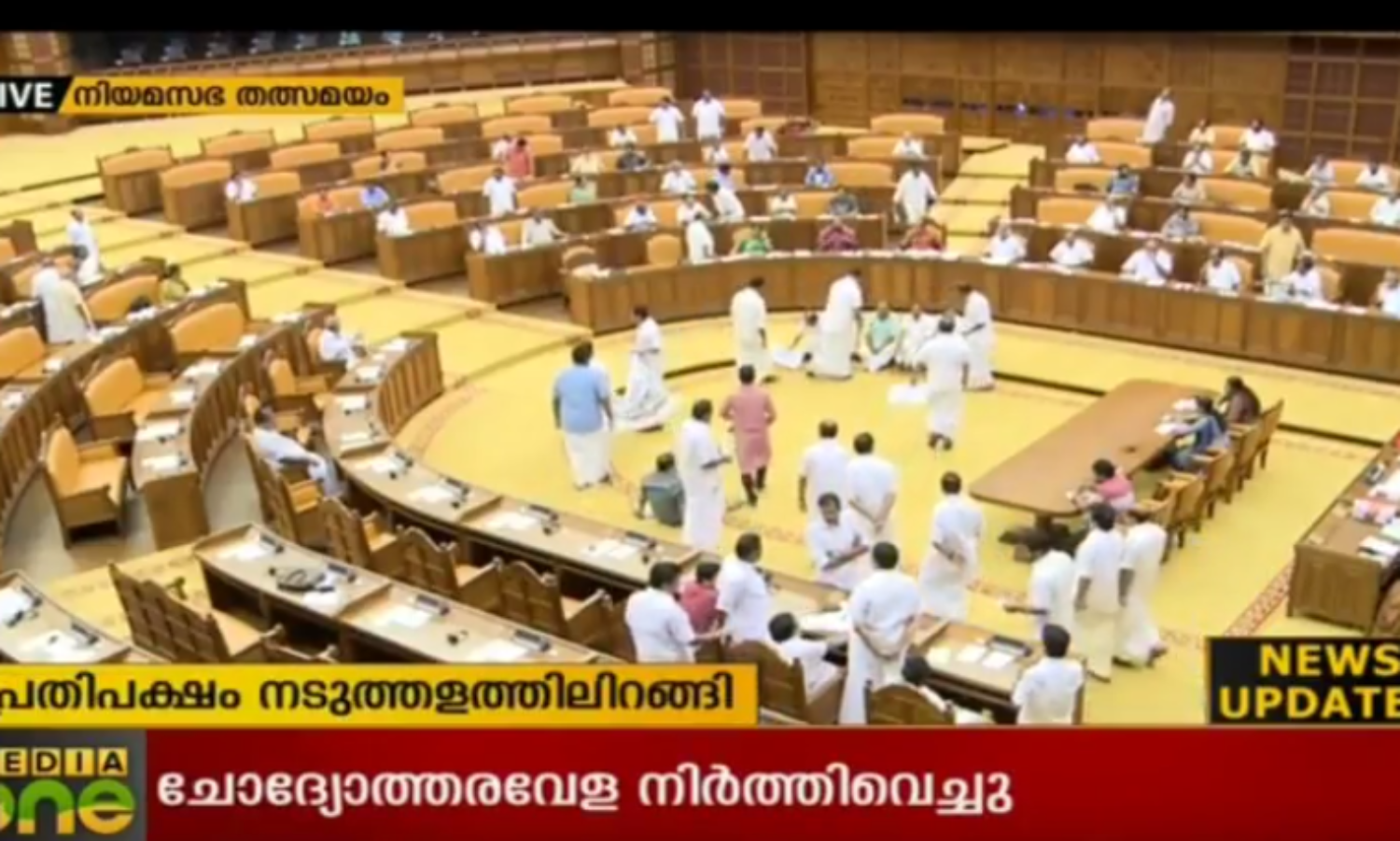 പ്രതിപക്ഷ ബഹളത്തിൽ തുടർച്ചയായ രണ്ടാം ദിവസവും നിയമസഭ സ്തംഭിച്ചു. പ്രതിഷേധത്തെ തുടർന്ന് ചോദ്യത്തരവേള സസ്പെൻഡ് ചെയ്ത സ്പീക്കർ പ്രതിപക്ഷത്തിന്റെ അടിയന്തിര പ്രമേയ നോട്ടീസ് പരിഗണിച്ചില്ല. ചെയറിലിരിക്കുന്നയാൾക് അംഗങ്ങളെ കാണാനുള്ള അവകാശം നിഷേധിച്ചുവെന്ന് സ്പീക്കർ പറഞ്ഞു. പ്രതിപക്ഷ പ്രതിഷേധത്തെ സർക്കാർ ഭയക്കുകയാണെന്ന് പ്രതിപക്ഷ നേതാവ് രമേശ് ചെന്നിത്തലയും കുറ്റപ്പെടുത്തി.