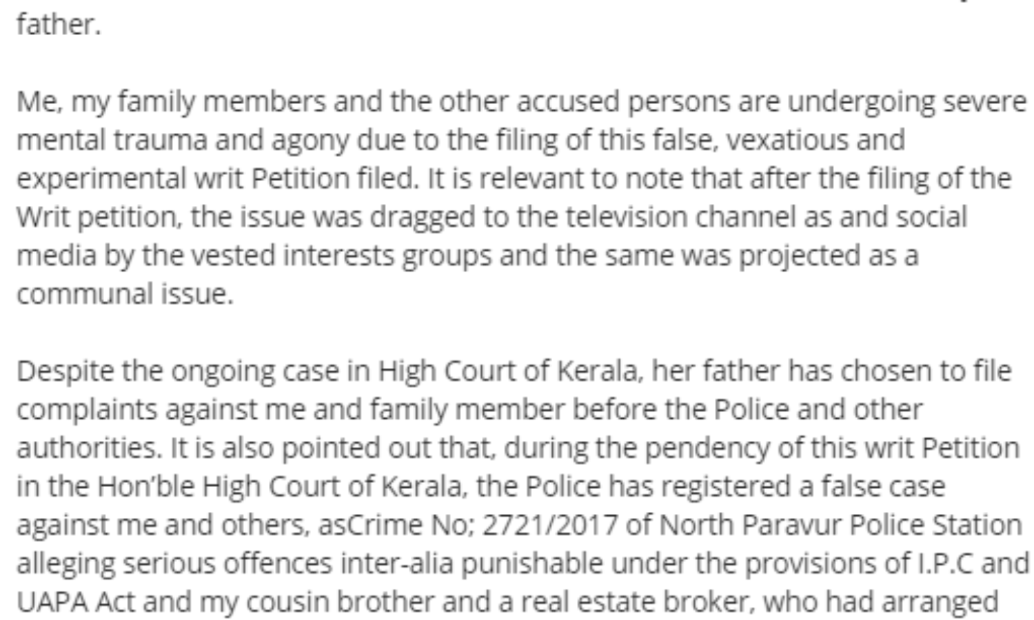 1. ശിവശക്തി യോഗ സെന്ററിലെ മുന് ഇന്സ്ട്രക്ടറായ ഞാന് ബഹുമാനപ്പെട്ട കോടതി മുമ്പാകെ സമര്പ്പിക്കുന്നു. എന്തെന്നാല് യോഗ കേന്ദ്രത്തിലെ ലൈംഗിക ചൂഷണം, പീഡനം, വിധ്വംസക പ്രവര്ത്തനം എന്നിവക്ക് ഞാന് സാക്ഷിയാണ്, യോഗകേന്ദ്രം പൊലീസിനെ ഉപയോഗിക്കുന്നതടക്കം പലകാര്യങ്ങളും എനിക്ക് ബഹുമാനപ്പെട്ട കോടതിയുടെ ശ്രദ്ധയില് പെടുത്താനുണ്ട്.