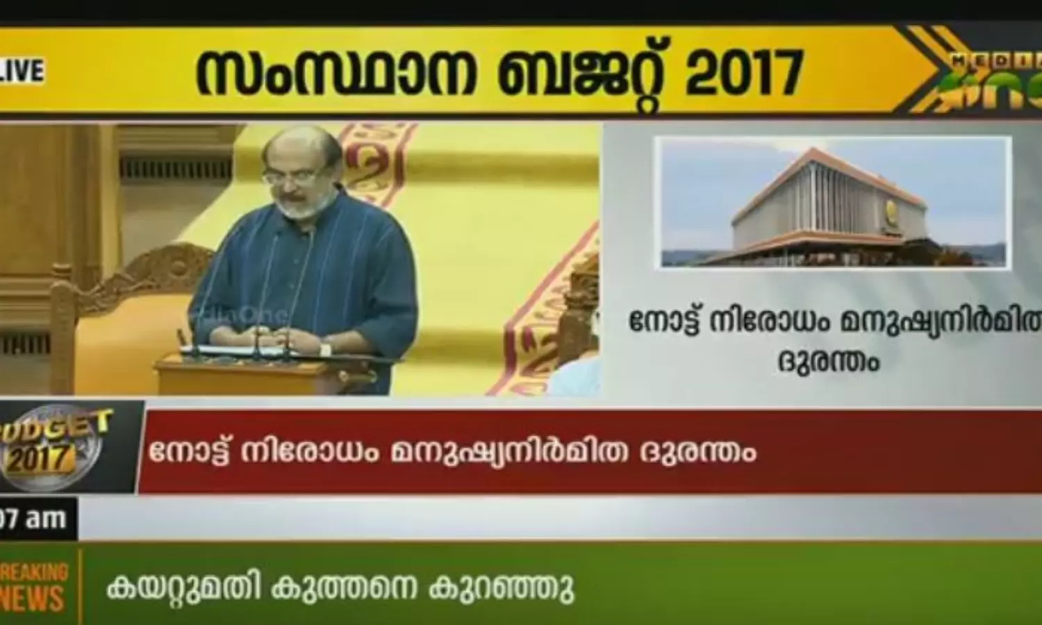 നോട്ട് നിരോധത്തെക്കുറിച്ച് എം ടി വാസുദേവന് നായരുടെ വാക്കുകള് ഉദ്ധരിച്ചാണ് ധനമന്ത്രി ബജറ്റ് അവതരണം തുടങ്ങിയത്. നോട്ട് നിരോധം മനുഷ്യനിര്മിത ദുരന്തമാണ്. സാധാരണക്കാരന്റെ ജീവിതം താറുമാറായി. ബാങ്കുകളില് നിന്ന് വായ്പയെടുക്കാന് ആളില്ലാതായി. കയറ്റുമതി കുത്തനെ കുറഞ്ഞു. നിക്ഷേപത്തിലും ഗണ്യമായ കുറവുണ്ടായി. നോട്ട് നിരോധം സംബന്ധിച്ച് കേന്ദ്രം പറയുന്നത് സാമാന്യ യുക്തിക്ക് നിരക്കാത്തതാണെന്നും ബജറ്റ് അവതരിപ്പിച്ചുകൊണ്ട് മന്ത്രി പറഞ്ഞു.