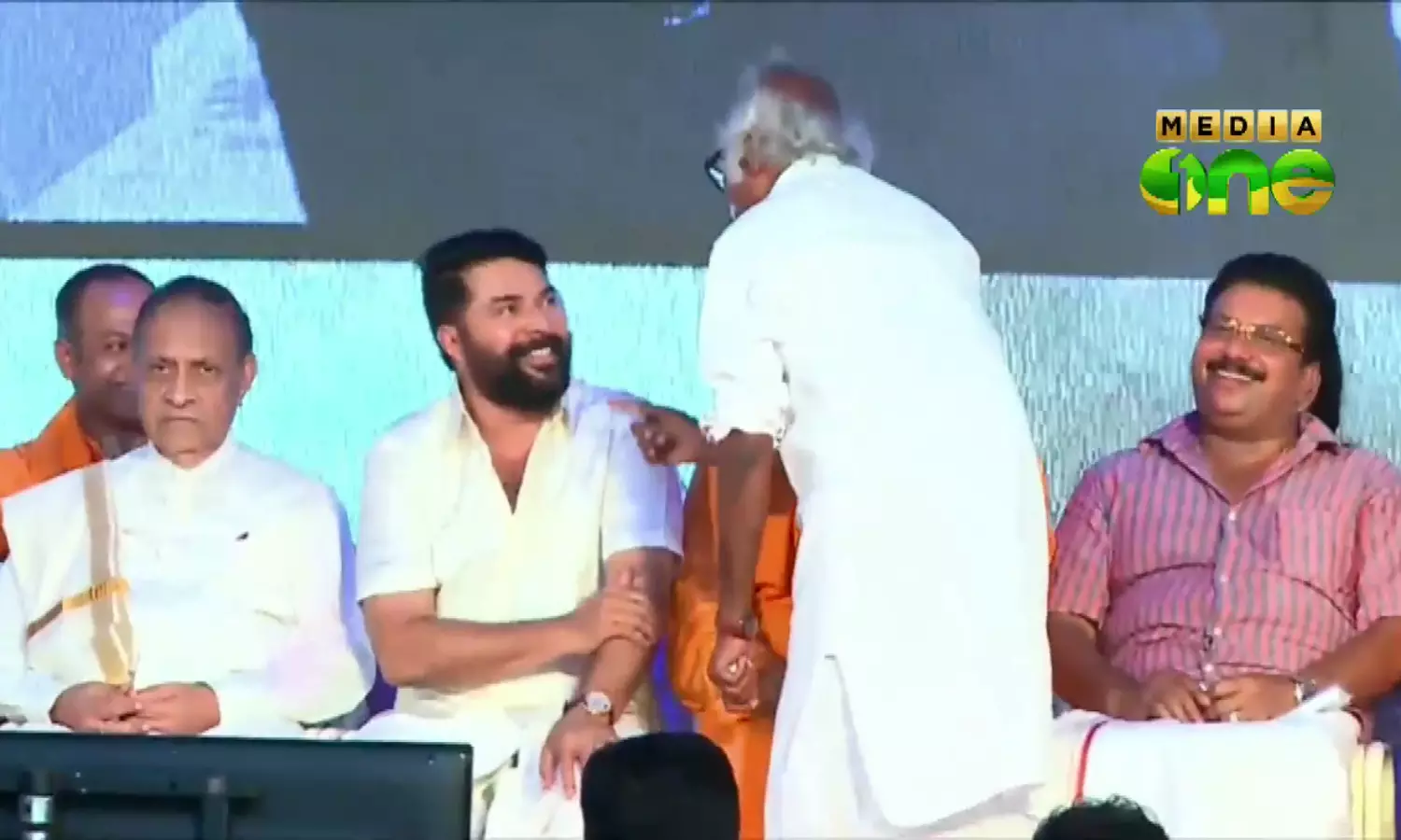 ശാന്തിഗിരി ആശ്രമത്തിലെ നവതി ആഘോഷങ്ങളുടെ ഭാഗമായുള്ള നവതി പുരസ്കാരം കരിക്കാനെത്തിയതായിരുന്നു മമ്മൂട്ടി. മന്ത്രി കടന്നപ്പളളി രാമചന്ദ്രനായിരുന്നു പരിപാടിയുടെ അധ്യക്ഷന്. മമ്മൂട്ടിയെ താന് ചേട്ടനെന്നാണ് വിളിക്കുന്നതെന്ന് പ്രസംഗത്തിനിടെ കടന്നപ്പളളി.