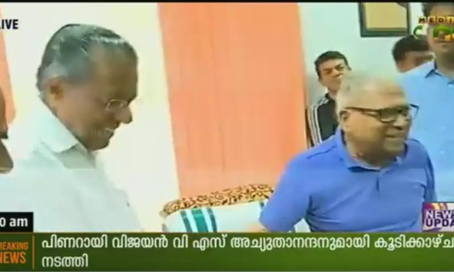 പിണറായി വിജയന് കന്റോണ്മെന്റ് ഹൌസിലെത്തി വി എസ് അച്യുതാനന്ദനുമായി കൂടിക്കാഴ്ച നടത്തി. കോടിയേരി ബാലകൃഷ്ണന് ഒപ്പമാണ് പിണറായി വിജയന് വി എസിനെ കാണാന് എത്തിയത്.. മുഖ്യമന്ത്രി പദം വഹിച്ചിട്ടുള്ള പ്രായോഗിക അനുഭവമുള്ള പാര്ട്ടി നേതാവെന്ന നിലയില് കാര്യങ്ങള് മനസിലാക്കാനാണ് വി എസിനെ കാണാന് എത്തിയതെന്ന് പിണറായി വിജയന് പറഞ്ഞു.