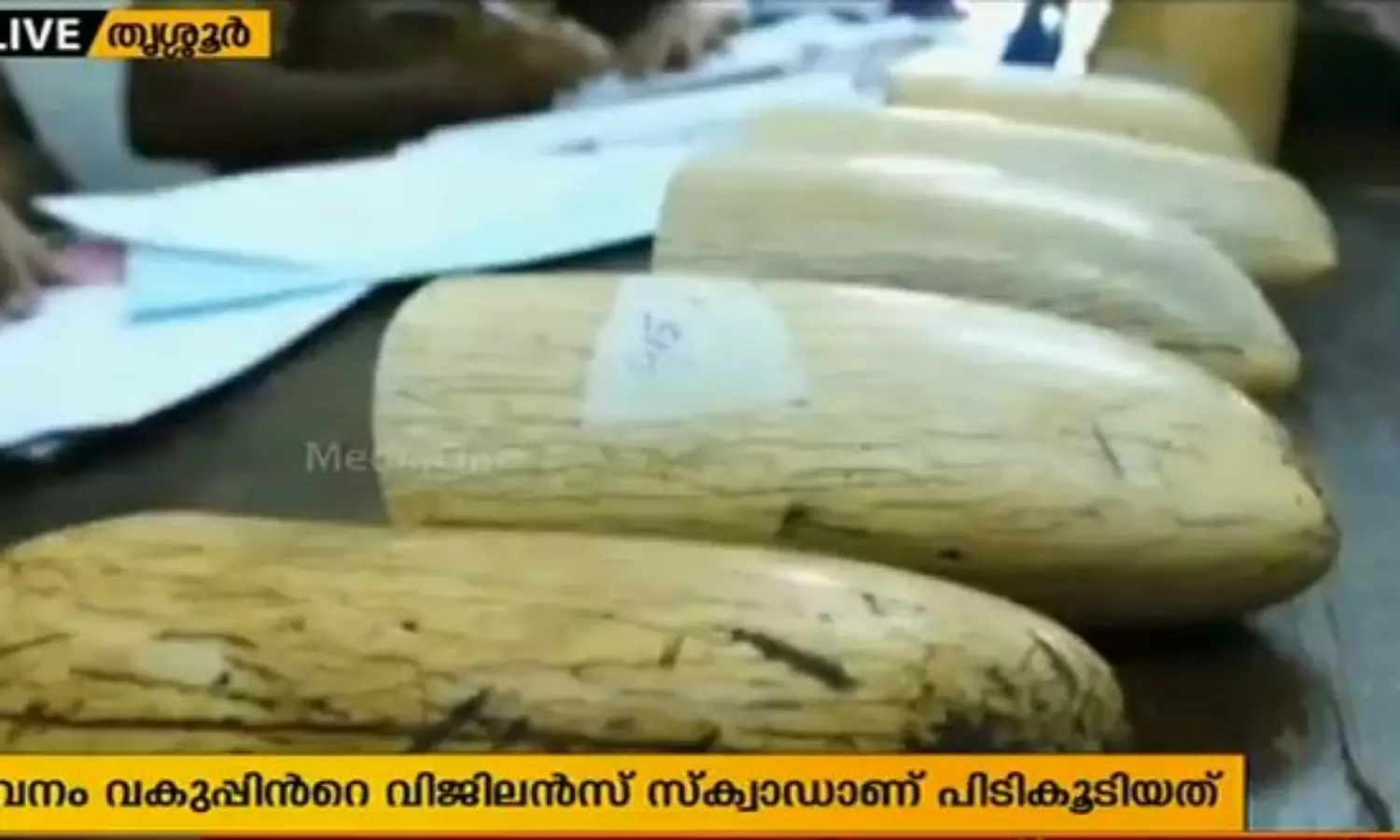 രഹസ്യ വിവരത്തിന്റെ അടിസ്ഥാനത്തില് എറണാംകുളം ഫ്ളയിംഗ് സ്കോഡ് ഡി.എഫ്.ഒ.ജി.പ്രസാദിന്റെ നേതൃത്വത്തില് തൃശൂര് ഫ്ളയിംഗ് സ്കോഡാണ് ആനക്കോട്ട പരിസരത്ത് പരിശോധന നടത്തിയത്. ഇതിനിടയിലാണ് പ്രതികള് വില്പ്പനയ്ക്കായി ആനകൊമ്പുകള് കവറിലാക്കി ബൈക്കില് വന്നത്. ഇവരില് നിന്ന് 6 ആനകൊമ്പുകളുടെ അഗ്രഭാഗങ്ങള് പിടികൂടിയിട്ടുണ്ട്. വനം വകുപ്പ് വിജിലന്സ് വിഭാഗം ഡിഎഫ്ഒ ജി പ്രസാദിന്റെ നേതൃത്വത്തിലുള്ള സംഘമാണ് ഇവരെ പിടികൂടിയത്