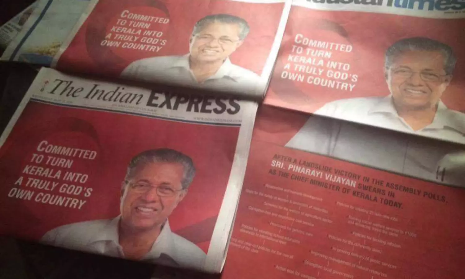 ദ ഹിന്ദു, ഇന്ത്യന് എക്സ്പ്രസ്, എക്കണോമിക് ടൈംസ്, ഹിന്ദുസ്ഥാന് ടൈംസ് തുടങ്ങി 6 ലധികം പത്രങ്ങളുടെ എല്ലാ എഡിഷനികളിലും പിണറായി വിജയന് സര്ക്കാരിന്റെ പരസ്യമുണ്ട്. ദൈവത്തിന്റെ സ്വന്തം നാടായി കേരത്തെ മാറ്റിയെടുക്കാന് സര്ക്കാര് പ്രതിഞ്ജാ ബന്ധമാണെന്നാണ് തലക്കെട്ട്. ഒപ്പം പുതിയ സര്ക്കാരിന്റെ വികസന പദ്ധതിളും മുഖ്യമന്ത്രിയുടെ ചിത്രവും. മുന് പേജില് മുഴുവനായി ഇങ്ങനെ പരസ്യം നല്കുന്നതിന് ചുരുങ്ങിയത് 4 കോടിയിലധികം ചിലവാണ് കണക്കാക്കപ്പെടുന്നത്. ഖജനാവ് കാലിയാണെന്ന് പറയുമ്പോള് തന്നെയാണ് ഇത്തരം പരസ്യങ്ങള് എന്ന് പ്രതിപക്ഷം ആരോപിക്കുന്നു.