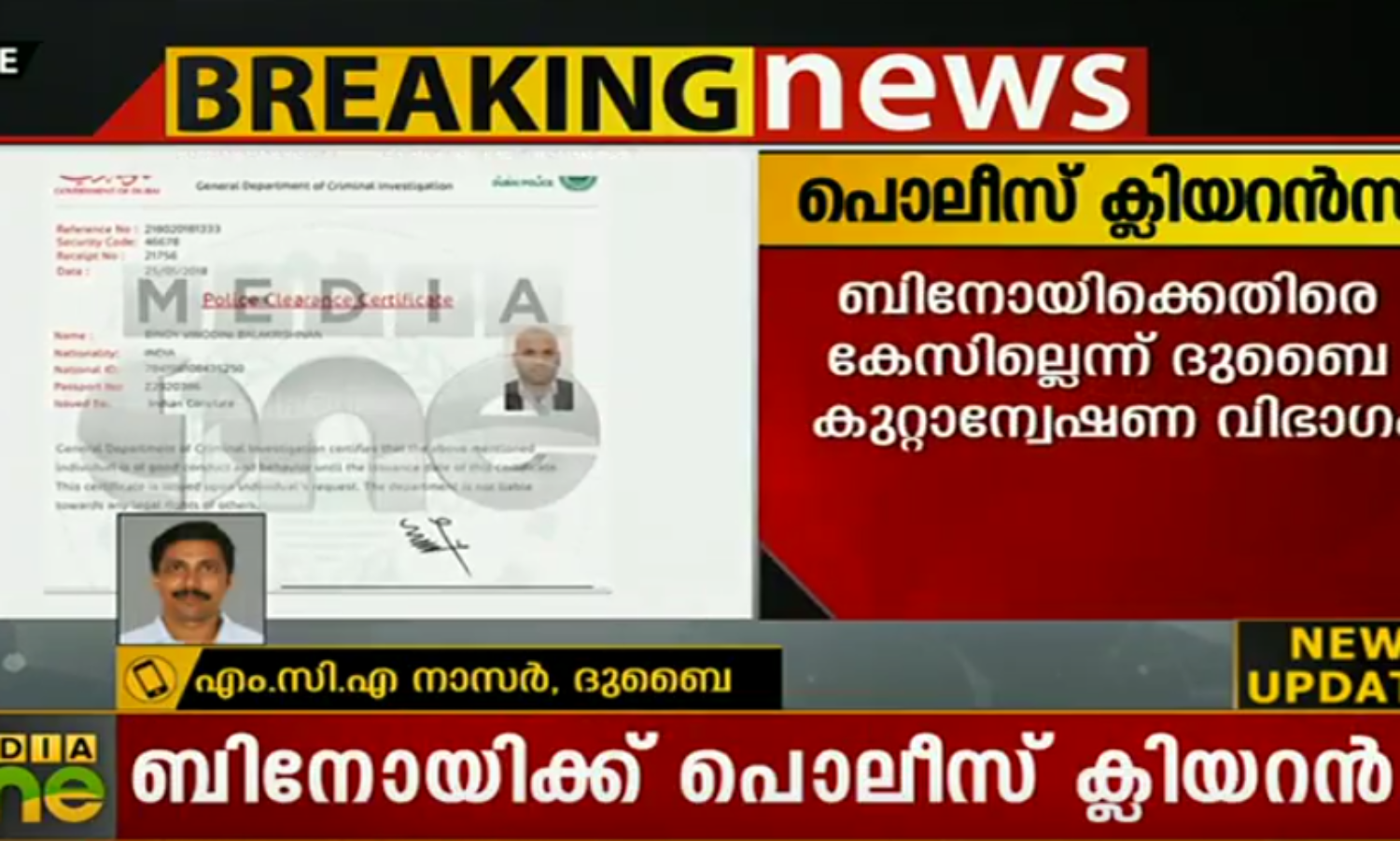 ബിനോയ് കോടിയേരിക്ക് ദുബൈ പൊലീസിന്റെ ക്ലിയറന്സ് സര്ട്ടിഫിക്കറ്റ്. ബിനോയ്ക്കെതിരെ കേസില്ല. ഇന്നത്തെ തീയതിയിലാണ്..