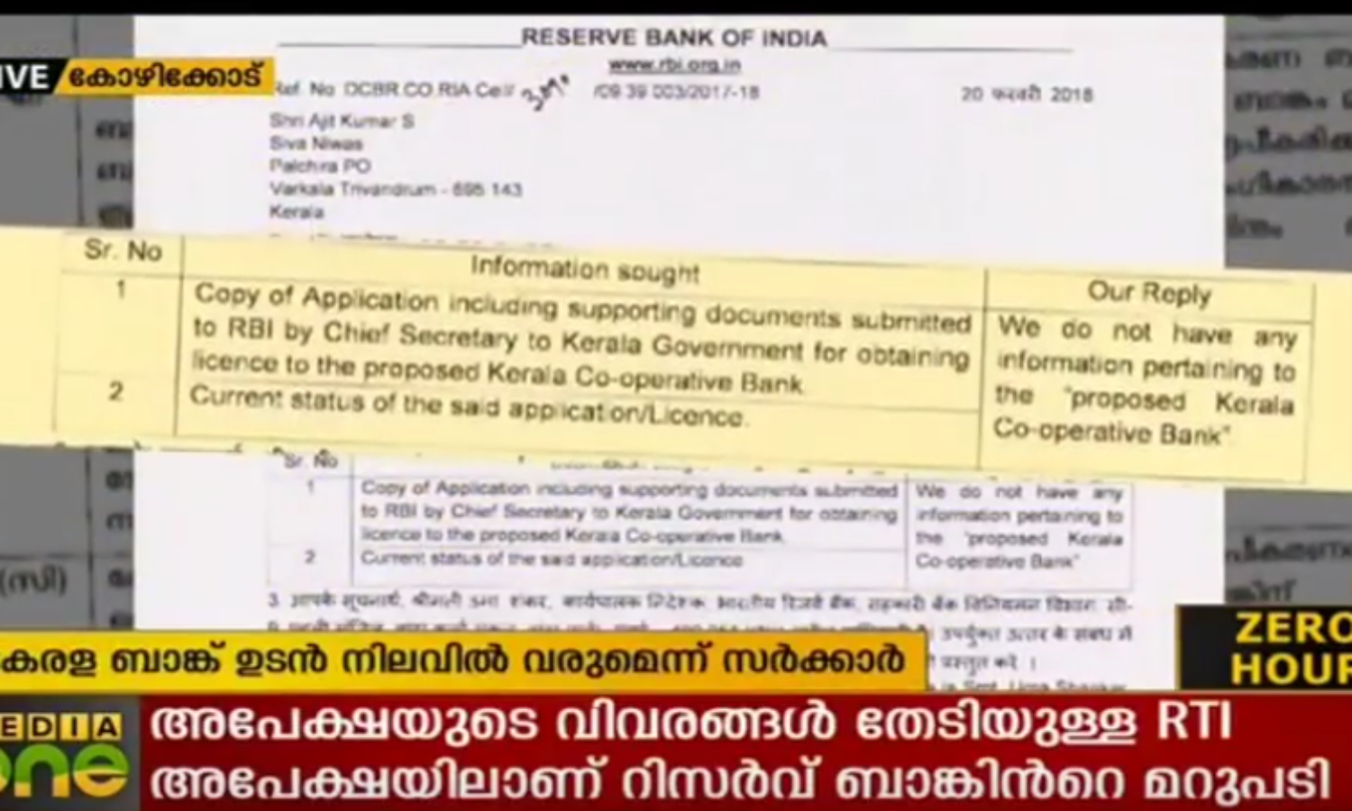 സംസ്ഥാനത്തിന്റെ സ്വന്തം ബാങ്ക് എന്ന ആശയത്തിലായിരുന്നു കേരള ബാങ്ക് രൂപീകരിക്കാനുള്ള സര്ക്കാര് തീരുമാനം. ജില്ലാ സഹകരണ ബാങ്കുകളും സ്റ്റേറ്റ് കോ ഓപ്പറേറ്റീവ് ബാങ്കും ലയിപ്പിച്ച് കേരള കോ-ഓപ്പറേറ്റീവ് ബാങ്ക് രൂപീകരിക്കുമന്നായിരുന്നു പ്രഖ്യാപനം. ആര്ബിഐ ലൈസന്സിനായി അപേക്ഷ നല്കിയതായി സഹകരണ മന്ത്രി കടകംപള്ളി സുരേന്ദ്രന് നിയമസഭയില് തന്നെ വ്യക്തമാക്കുകയും ചെയ്തു. ഇനി വിവരാവകാശനിയമ പ്രകാരം റിസര്വ് ബാങ്ക് നല്കിയ മറുപടി കാണുക. കേരള ബാങ്ക് സംബന്ധിച്ച് റിസര്വ് ബാങ്കിന് ഒന്നും അറിയില്ലെന്ന് മറുപടിയില് വ്യക്തം.