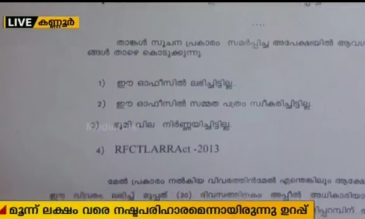 വയല് വിട്ട് നല്കാന് സമ്മതമറിയിച്ച് സിപിഎം പ്രാദേശിക നേതൃത്വം ശേഖരിച്ച പ്രദേശവാസികളുടെ സമ്മതപത്രം ഓഫീസില് ലഭിച്ചിട്ടില്ലെന്നും ദേശീയപാത അതോറിറ്റി.