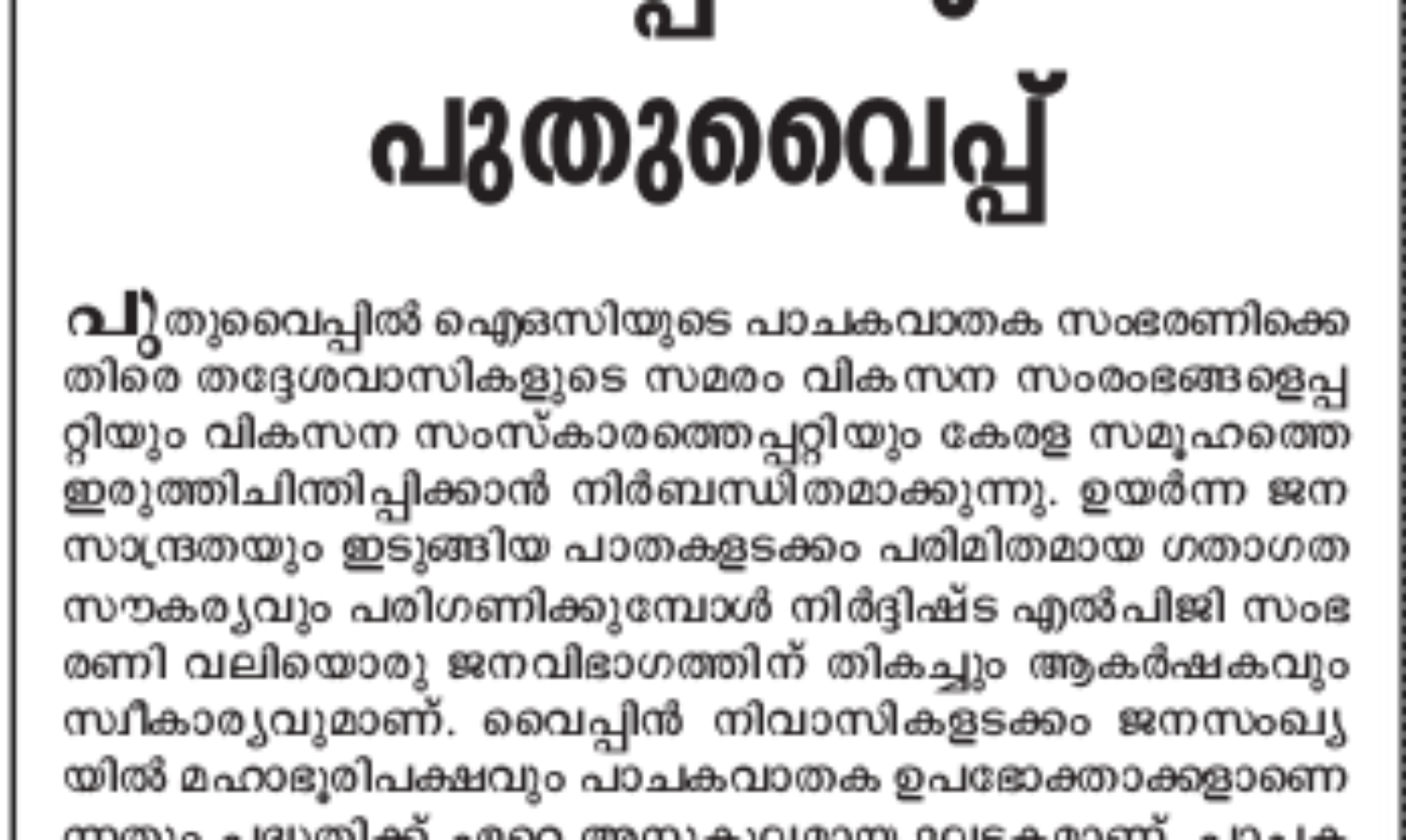 കേരളത്തെ ഇരുത്തി ചിന്തിപ്പിക്കുന്ന പുതുവൈപ്പ് എന്ന തലക്കെട്ടോടെയാണ് എഡിറ്റോറിയല് പ്രസിദ്ധീകരിച്ചിരിക്കുന്നത്
