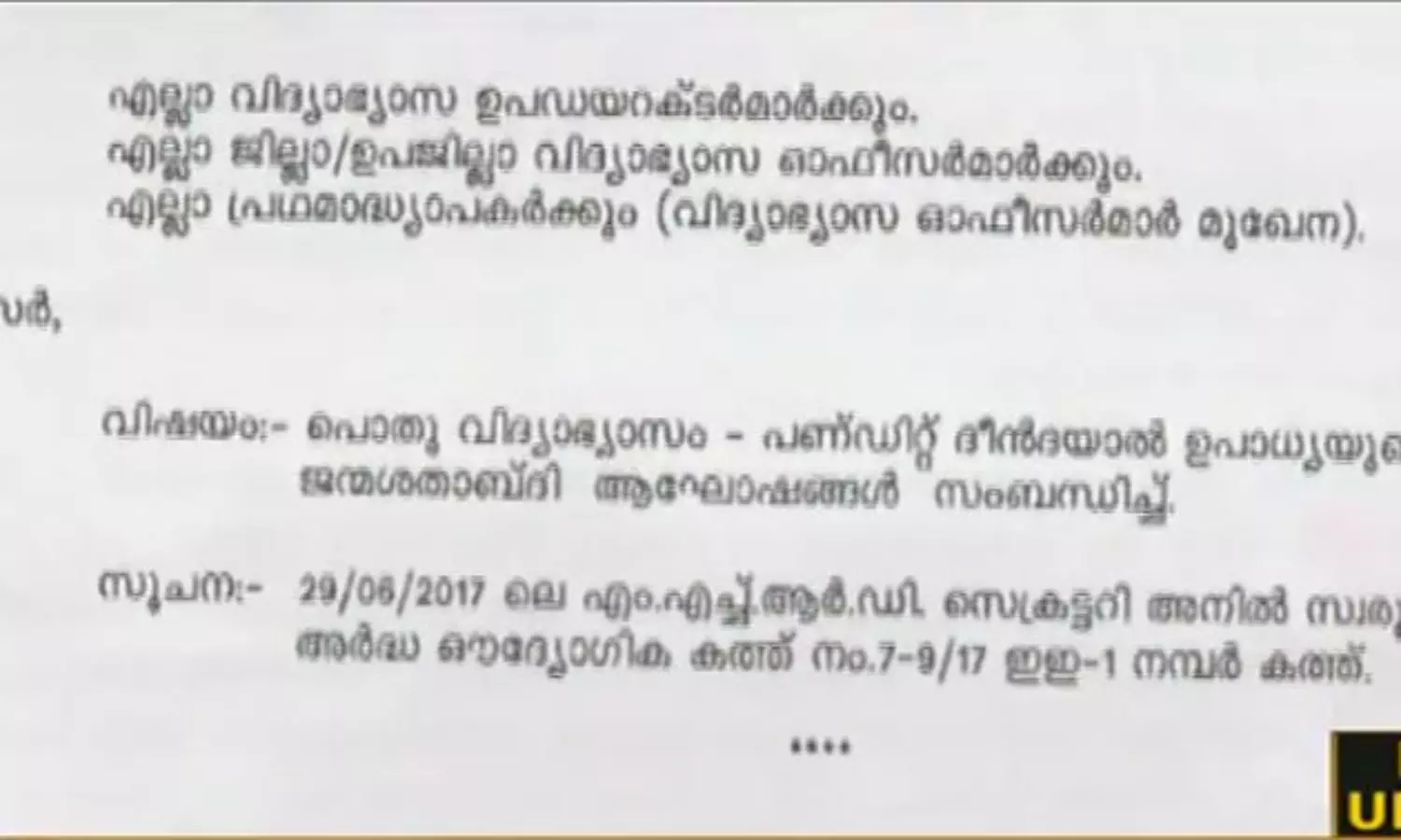 ദീന് ദയാല് ഉപാധ്യായയുടെ നൂറാം ജന്മ വാര്ഷികത്തോടനുബന്ധിച്ച് സ്കൂളുകളില് ആഘോഷ പരിപാടികളും മത്സരങ്ങളും സംഘടിപ്പിക്കണമെന്ന് ആവശ്യപ്പെട്ട് കേന്ദ്ര മാനവ വിഭവശേഷി മന്ത്രാലയം സംസ്ഥാനത്തിന് കത്തയച്ചിരുന്നു. ഈ കത്തുമായി ബന്ധപ്പെട്ട് തുടര് നടപടികള് സ്വീകരിക്കാനാണ് പൊതു വിദ്യാഭ്യാസ ഡയറക്ടറുടെ നിര്ദേശം. വിദ്യാഭ്യാസ ഉപ ഡയറക്ടര്മാര്ക്കും ജില്ല വിദ്യാഭ്യാസ ഓഫീസര്മാര്ക്കും ഉപജില്ലാ വിദ്യാഭ്യാസ ഓഫീസര്ക്കുമാണ് ഡിപിഐയുടെ സര്ക്കുലര്. ഉപജില്ലാ വിദ്യാഭ്യാസ ഓഫീസര്മാര്ക്ക് സ്കൂളുകളിലെ പ്രഥമ അധ്യാപകര്ക്ക് ഇത് സംബന്ധിച്ച് നിര്ദേശം നല്കാനാണ് സര്ക്കുലറില് പറയുന്നത്.