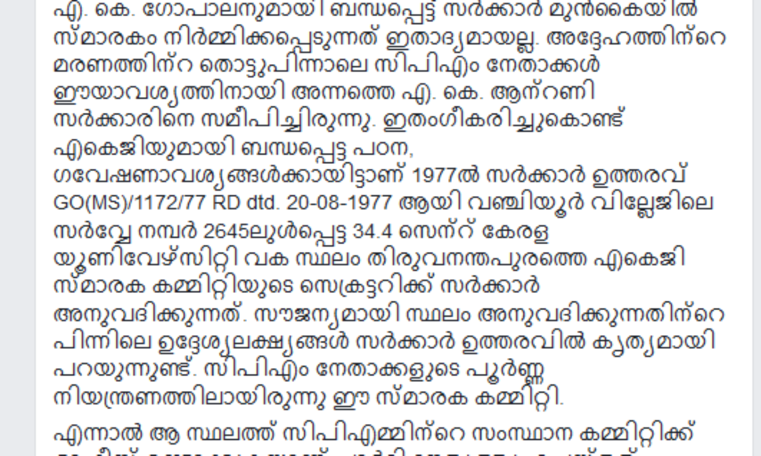 എകെജിയോടും അദ്ദേഹത്തിന്റെ സ്മരണകളോടുമുള്ള താത്പര്യം ആത്മാർത്ഥമാണെങ്കിൽ സർക്കാർ ചെയ്യേണ്ടത് തിരുവനന്തപുരത്ത് സർക്കാർ സൗജന്യമായി അനുവദിച്ച ഭൂമിയിലെ കെട്ടിടത്തിൽ നിന്ന് സിപിഎം പാർട്ടി ഓഫീസ് പൂർണ്ണമായി ഒഴിപ്പിച്ച് അത് പൊതുജനങ്ങൾക്ക് പ്രാപ്യമായ തരത്തിൽ ഒരു സ്വതന്ത്ര മ്യൂസിയമായും ഗവേഷണകേന്ദ്രമായും മാറ്റുകയാണെന്ന് വിടി ബലറാം എംഎല്എ. എകെജി സ്മാരകത്തിന് 10 കോടി രൂപ നീക്കിവച്ചുള്ള ബജറ്റ് തീരുമാനത്തോട് ഫേസ്ബുക്കിലൂടെയായിരുന്നു ബലറാമിന്റെ പ്രതികരണം.