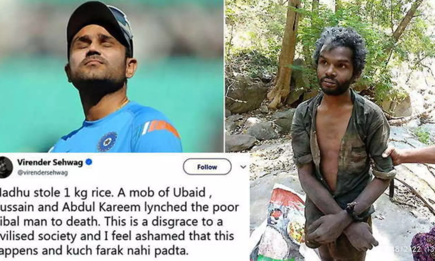 ''മധു ഒരു കിലോഗ്രാം അരി മോഷ്ടിച്ചു. ഉബൈദ്, ഹുസൈന്, അബ്ദുല്കരീം എന്നിവരടങ്ങുന്ന സംഘം ആ ആദിവാസി യുവാവിനെ കൂട്ടക്കൊല ചെയ്തു. പരിഷ്കൃത സമൂഹത്തിന് ഇത് അപമാനമാണ്. ഇങ്ങിനെയൊക്കെ സംഭവിച്ചിട്ടും ആര്ക്കും ഒരു കുഴപ്പവുമില്ലെന്നതില് ഞാന് ലജ്ജിക്കുന്നു.'' ഇതായിരുന്നു സെവാഗിന്റെ ട്വീറ്റ്. ട്വീറ്റിന് താഴെ #muslimskillmadhu എന്ന ഹാഷ് ടാഗുകളും പ്രചരിച്ചതോടെ സംഭവം വിവാദായി.