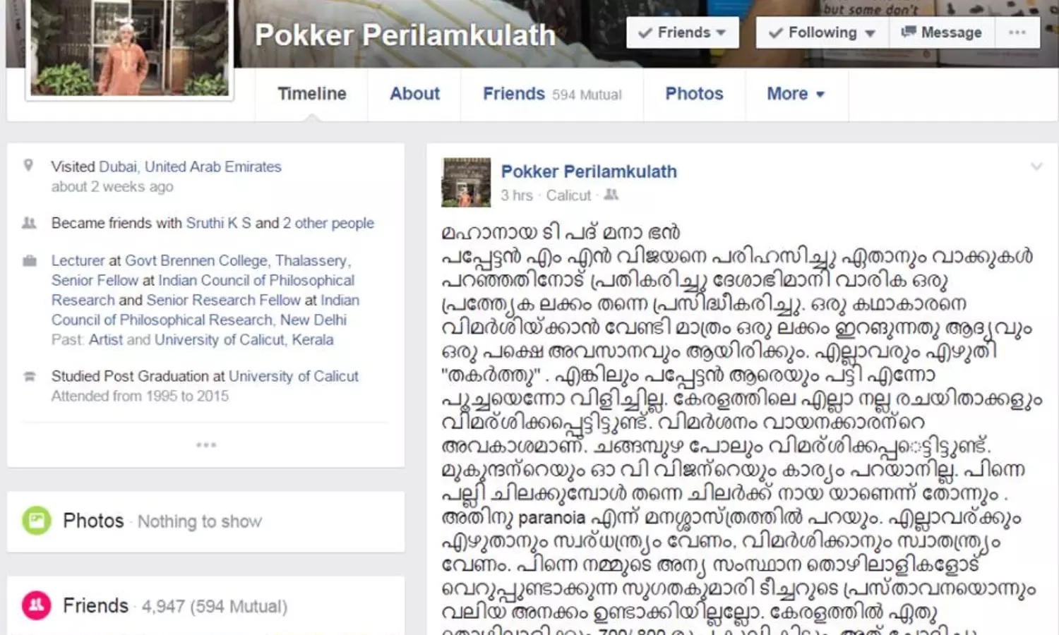 വിമര്ശനം വായനക്കാരന്റെ അവകാശമാണെന്നും പല്ലി ചിലക്കുമ്പോള് തന്നെ ചിലര്ക്ക് നായയാണെന്ന് തോന്നുമെന്നും അതിന് paranoia എന്ന് മനശ്ശാസ്ത്രത്തിൽ പറയുമെന്ന് ഡോ പോക്കര് ഫേസ്ബുക്കില് കുറിച്ചു.