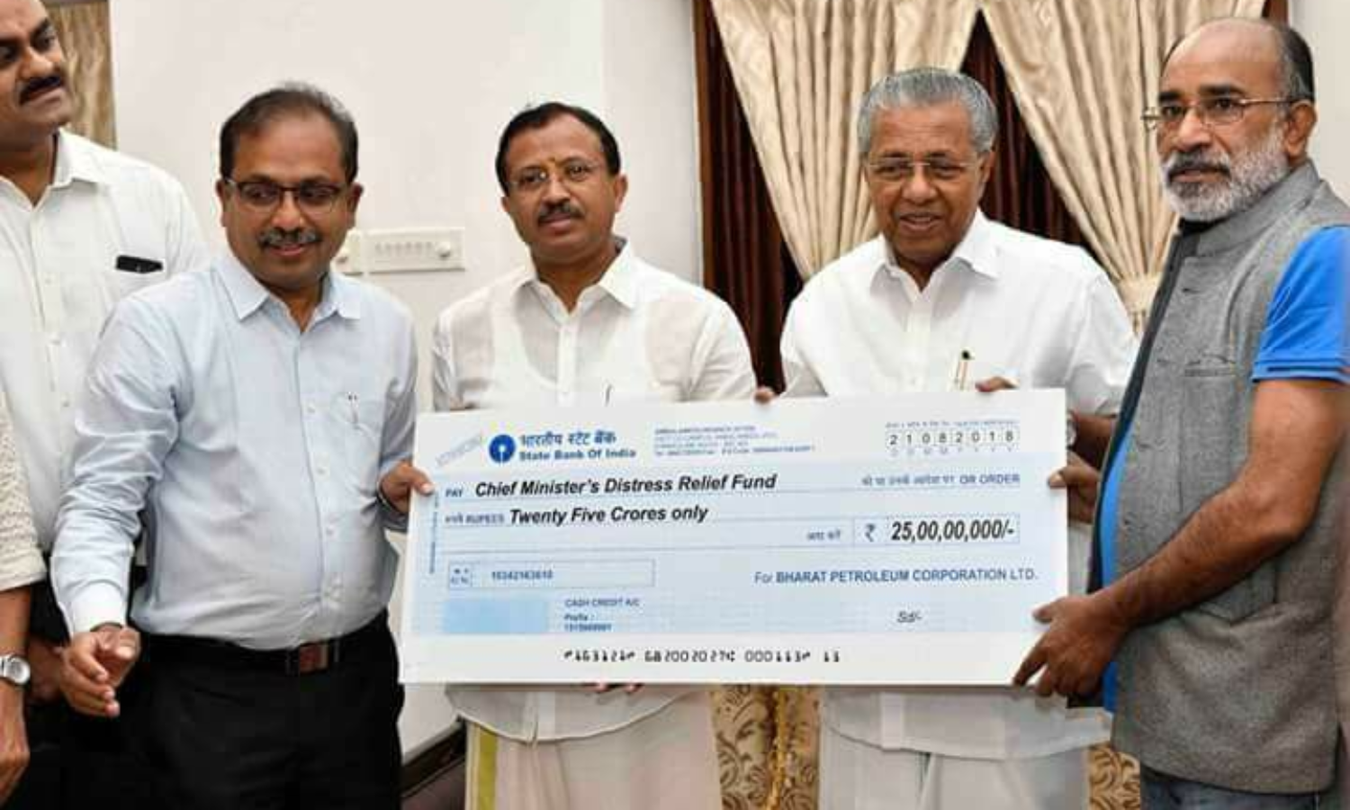 മുഖ്യമന്ത്രിയുടെ ദുരിതാശ്വാസ നിധിയിലേക്ക് ബി.ജെ.പി കേന്ദ്രമന്ത്രിമാരും എംപിമാരും 25 കോടി സംഭാവന ചെയ്തെന്ന പ്രചാരണം പൊളിച്ചടുക്കി സോഷ്യല് മീഡിയ. ഭാരത് പെട്രോളിയം 25 കോടിയുടെ ചെക്ക് കൈമാറുന്ന ചിത്രമാണ് ബിജെപി അനുകൂലികള് വ്യാജ പ്രചാരണത്തിന് ഉപയോഗിച്ചത്. ബി.ജെ.പി കേന്ദ്ര മന്ത്രിമാരും എം.പിമാരും സംഭാവന നല്കുന്നു എന്ന് പറഞ്ഞാണ് വ്യാജ വാര്ത്ത പടച്ചുവിട്ടത്. മുഖ്യമന്ത്രിയുടെ ദുരിതാശ്വാസ നിധിയിലേക്ക് ഭാരത് പെട്രോളിയം നല്കുന്ന ചെക്കും ചിത്രവും ഉപയോഗിച്ചായിരുന്നു ഈ കളി.