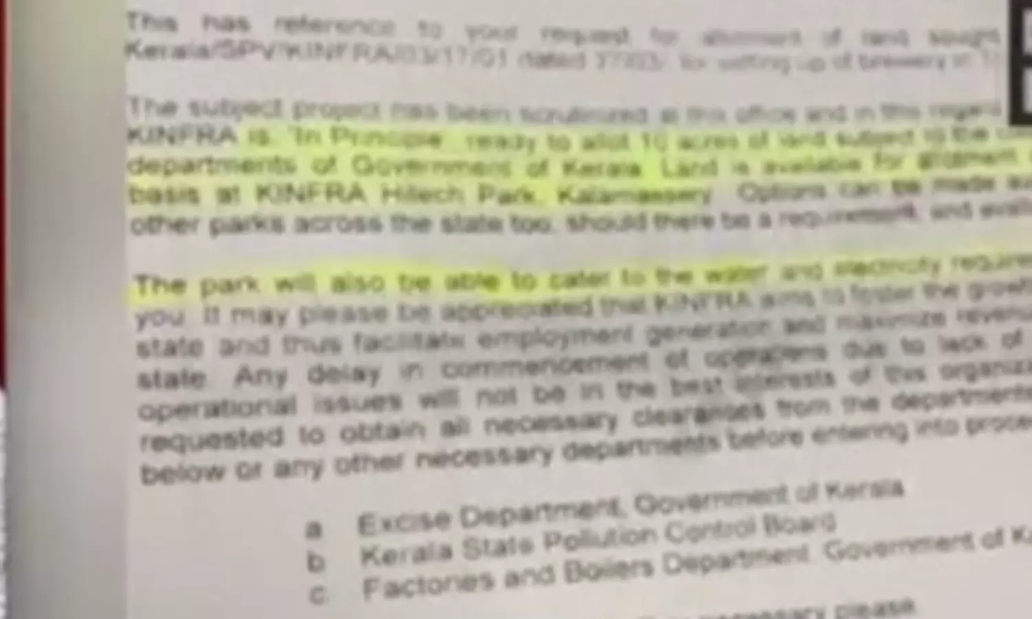 10 ഏക്കര് സ്ഥലം കളമശ്ശേരിയിലെ ഹൈടെക് പാര്ക്കില് അനുവദിക്കാം. കിന്ഫ്രയുടെ മറ്റു പാര്ക്കുകളില് സ്ഥലം വേണമെങ്കിലും അതും പരിശോധിക്കാം. ജലം, വൈദ്യുതി എന്നിവക്ക് സൌകര്യമൊരുക്കാമെന്നും സമ്മതപത്രത്തില് പറയുന്നു. ഈ സമ്മതപത്രം അടിസ്ഥാനമാക്കിയാണ് ബ്രൂവറിക്കുള്ള അനുമതിക്കായി പവര് ഇന്ഫ്രാടെക് എക്സൈസ് വകുപ്പിന് അപേക്ഷ നല്കുന്നത്.