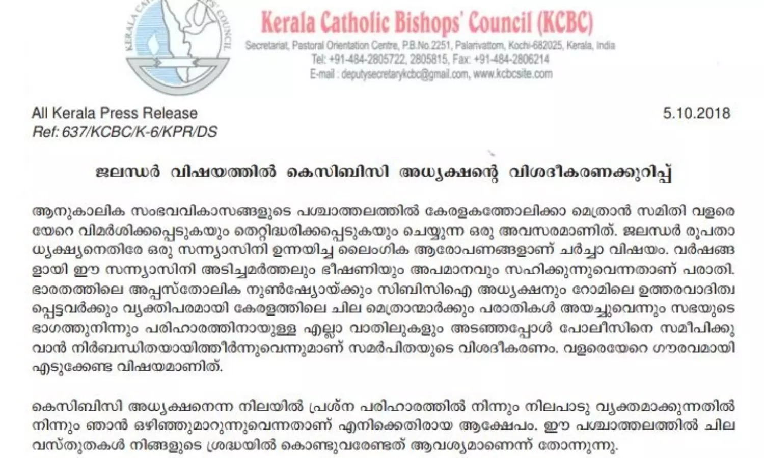 ജലന്ധര് ബിഷപ്പിനെതിരായ കന്യാസ്ത്രീയുടെ പരാതി: വിശദീകരണവുമായി കെ.സി.ബി.സി അധ്യക്ഷന്