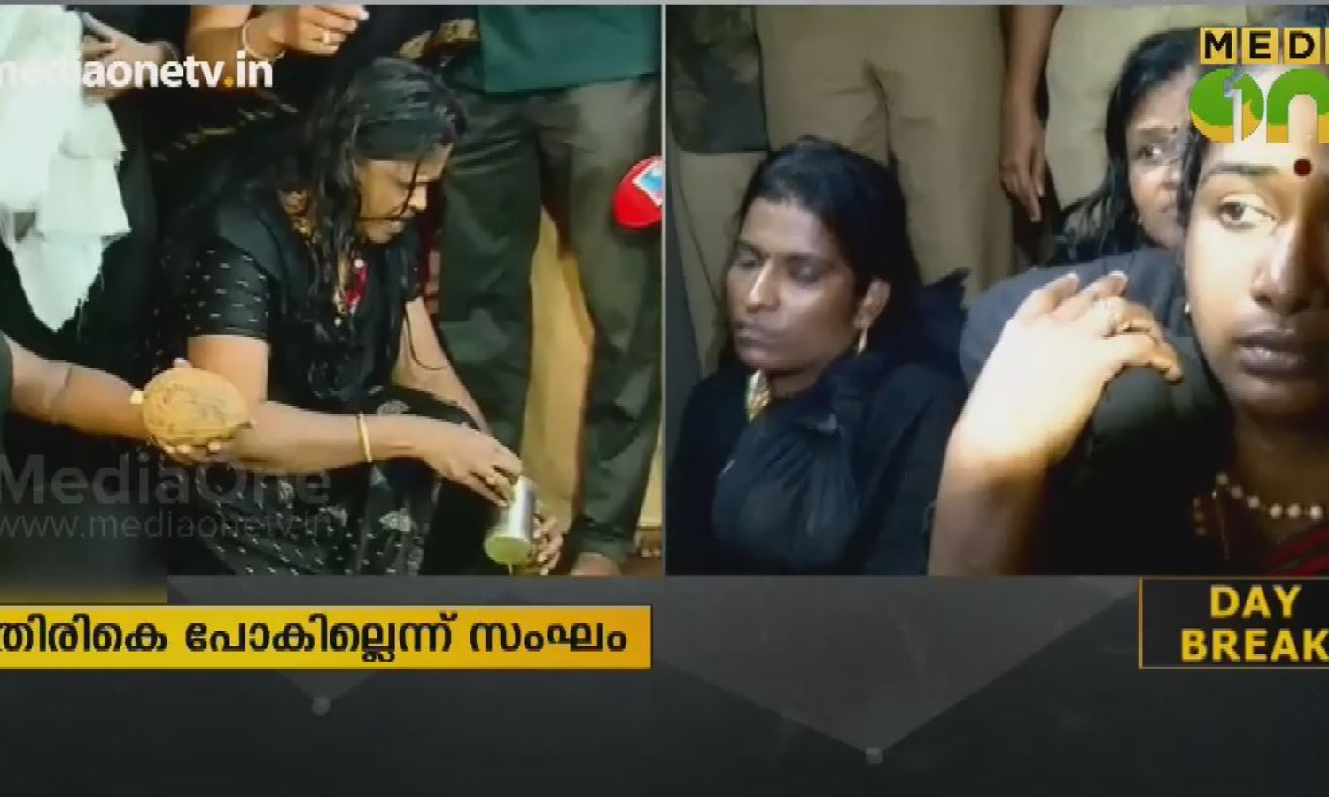 പൊലീസ് സംഘം ബി.ജെ.പി പ്രവര്ത്തകരെ നീക്കി യാത്ര തുടര്ന്നു. തുടര്ന്ന് കുട്ടിക്കാനം വഴി കോട്ടയം ജില്ലയിലേക്ക്. കോട്ടയം ജില്ലയില് നിന്ന് വാഹനത്തെ പിന്തുടര്ന്ന മാധ്യമപ്രവര്ത്തകരെ ഒഴിവാക്കി മറ്റൊരു വഴിയിലൂടെ പമ്പയിലേക്ക്. ബേസ് കാമ്പായ നിലക്കലില് വന് സുരക്ഷയാണ് ഒരുക്കിയിരുന്നത്. നിലക്കലില് പോലും നിര്ത്താതെ പുലര്ച്ചെ മൂന്നരയോടെ മനീതി സംഘവുമായി പൊലീസ് നേരെ പമ്പയിലേക്കെത്തി.