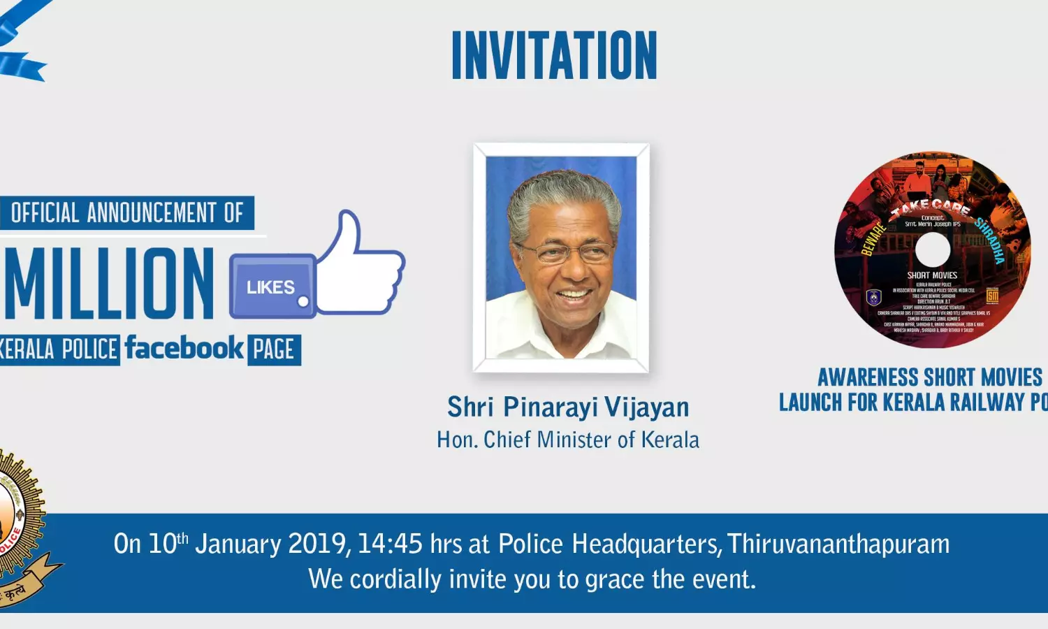 സോഷ്യല് മീഡിയ വഴി പൊലീസിന്റെ മാര്ഗനിര്ദ്ദേശങ്ങളും മുന്നറിയിപ്പുകളും, ട്രാഫിക് - സൈബര് സംബന്ധമായ ബോധവൽക്കരണവും, നിയമകാര്യങ്ങള് എന്നിവ ജനങ്ങളെ ബോധവത്കരിക്കുന്നതിന് വേണ്ടിയാണ് കേരള പൊലീസ് ഫെയ്സ്ബുക്ക് പേജ് ആരംഭിച്ചത്. ഇത്തരത്തിലുള്ള പ്രവര്ത്തനങ്ങള് പൊതു ജനങ്ങള് കൈനീട്ടി സ്വീകരിച്ചതോടെ വന് ജനപിന്തുണയാണ് കേരള പൊലീസിന്റെ ഫെയ്സ് ബുക്ക് പേജിന് ലഭിച്ചിരുന്നത്. പേജില് ട്രോളുകളുടേയും, വീഡിയോകളുടേയും രൂപത്തില് അവതരിപ്പിച്ച ആശയം വന് ഹിറ്റായതോടെയാണ് ലോകോത്തര പൊലീസ് പേജുകളെ പിന്നിലാക്കി കേരള പൊലീസിന്റെ ഫെയ്സ് ബുക്ക് പേജ് നേട്ടം കൊയ്യുന്നത്. ചടങ്ങില് ഡിജിപി ശ്രീ. ലോക്നാഥ് ബെഹ്റ ഐപിഎസ്, എഡിജിപി ശ്രീ. മനോജ് എബ്രഹാം ഐപിഎസ് തുടങ്ങിയവര് പങ്കെടുക്കും