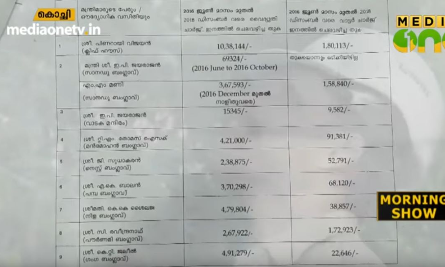 2016 ജൂണ് മുതല് 2018 ഡിസംബര് വരെയുള്ള കാലയളവിലെ മാത്രം കണക്കുകള് പ്രകാരം ശരാശരി മൂന്ന് ലക്ഷത്തോളം രൂപയാണ് ഓരോ മന്ത്രി മന്ദിരങ്ങളിലും വൈദ്യുതി ബില്ലിനായി മാസത്തില് ചെലവഴിക്കുന്നത്